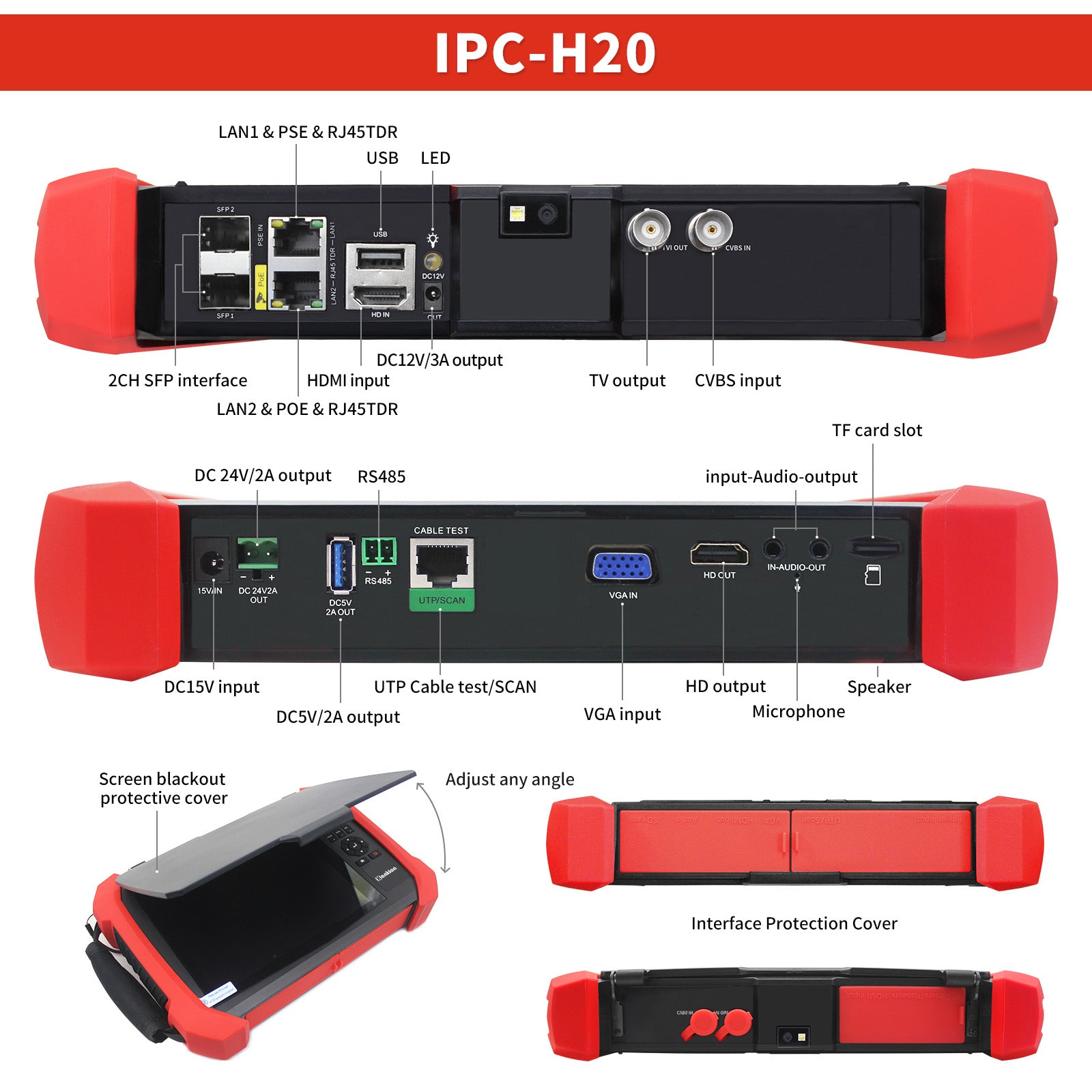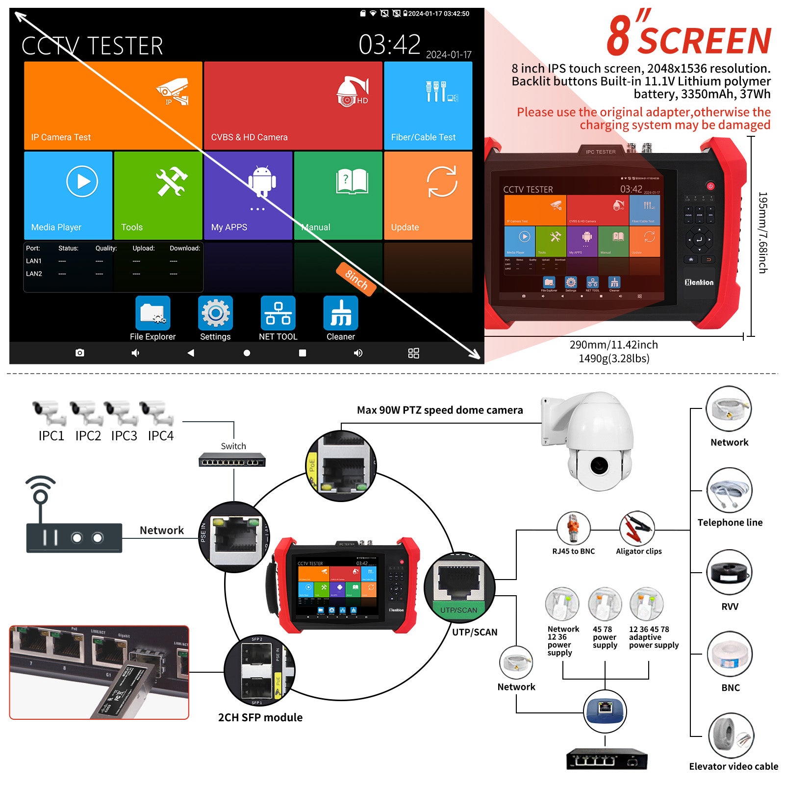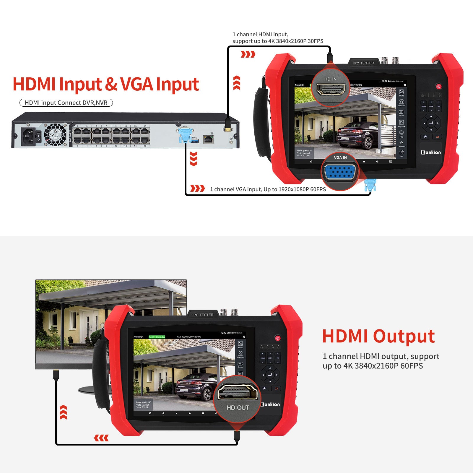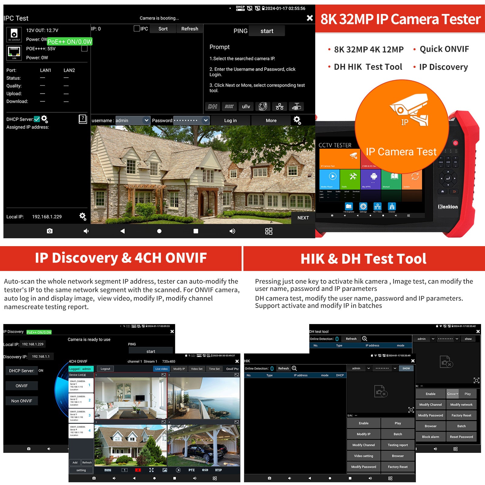 Henkion H20 CCTV tester Support max 8K 32MP 24FPS IP camera test, Support ONVIF protocol.