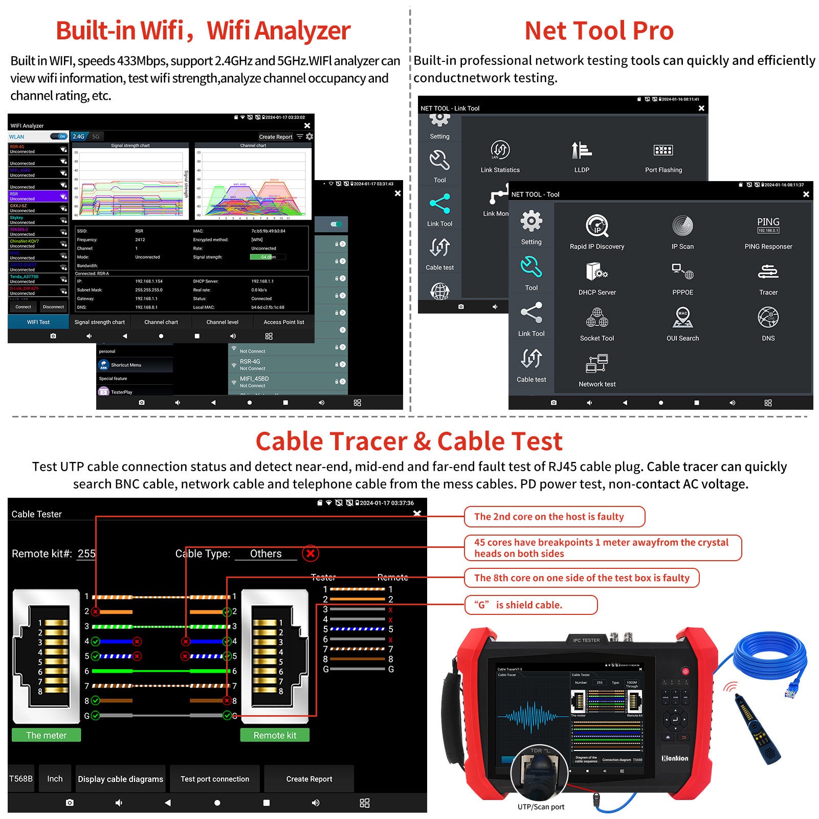 | WiFi analyzer | Built-in WIFl analyzer can view wifi information, test wifi strength,analyze channel occupancy and channel rating, etc. |
