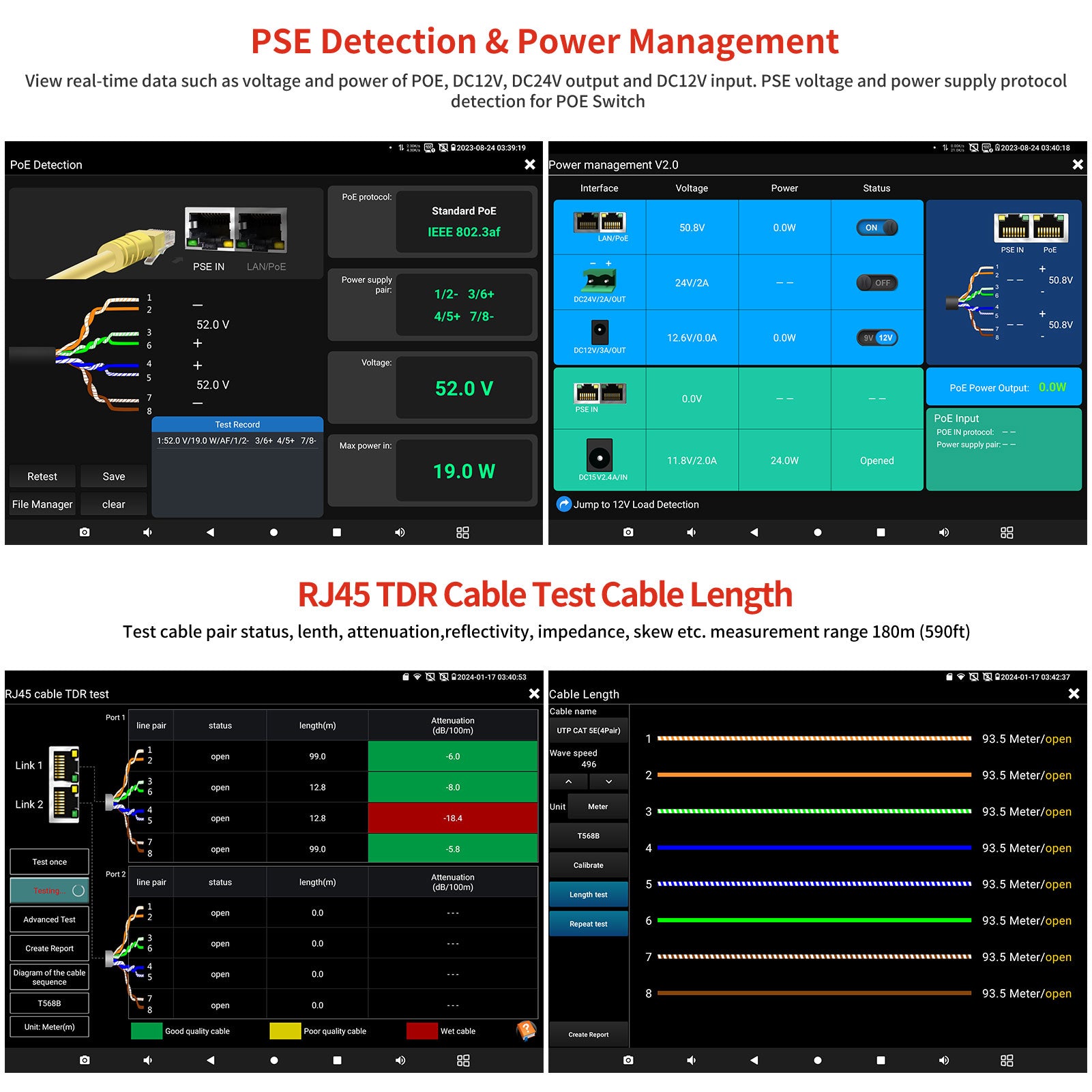 View real-time data such as voltage and power of POE, DC12V, DC24V output, and DC12V input. PSE voltage and power supply protocol detection for POE Switch.