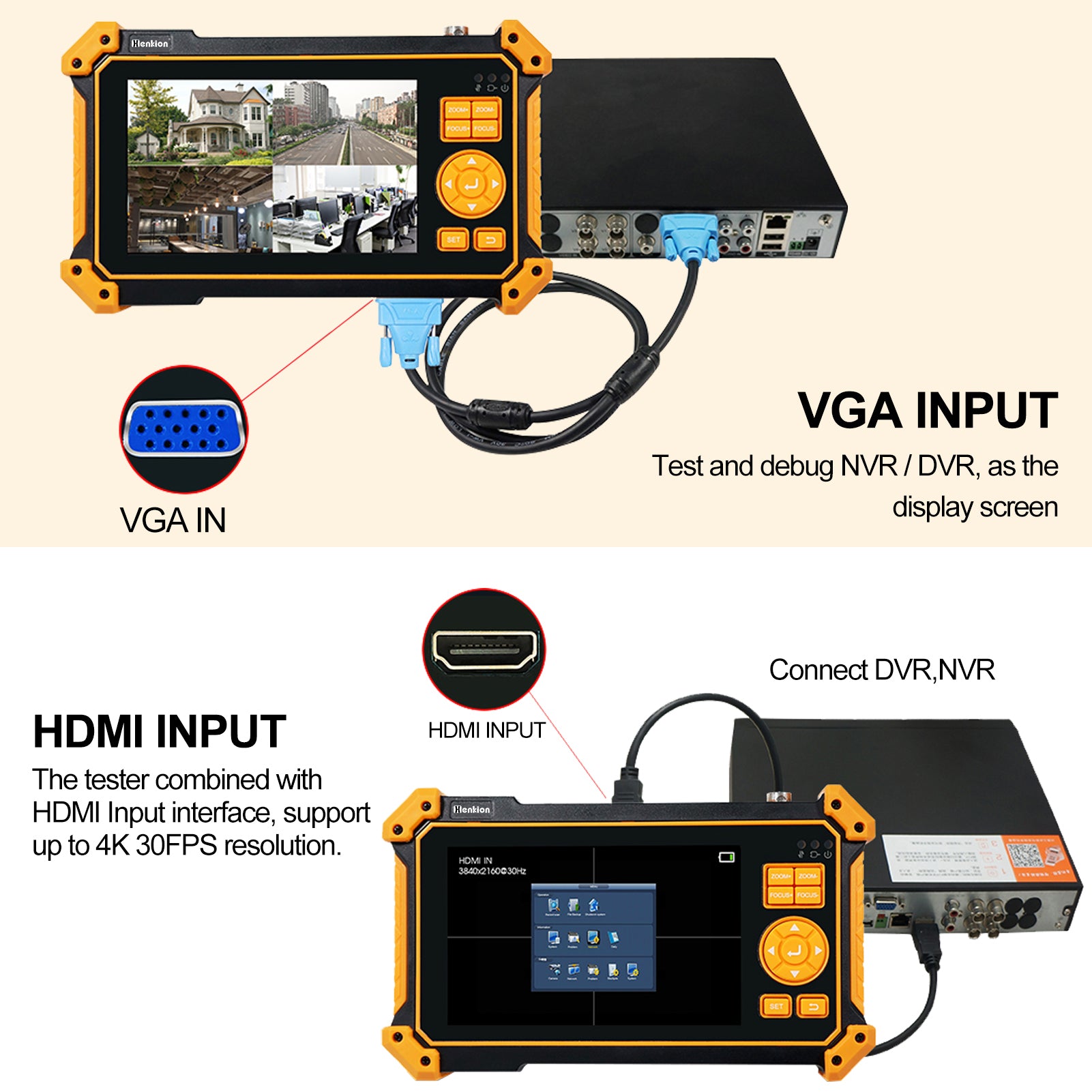 HD-3100 uses 5-inch TFT-LCD screen(Non-touch screen) and can support the testing of up to 4K 8MP HD CVI TVI AHD camera and CVBS cameras, but it does not support IP camera and SDI camera testing. Built-in professional test software, UTP cable test, PTZ controller, power output, HDMI&VGA input, audio input, and RS485 are all available. Using a self-developed operating system (based on Linux), work is stable and reliable. You can continue to view the details to learn more.