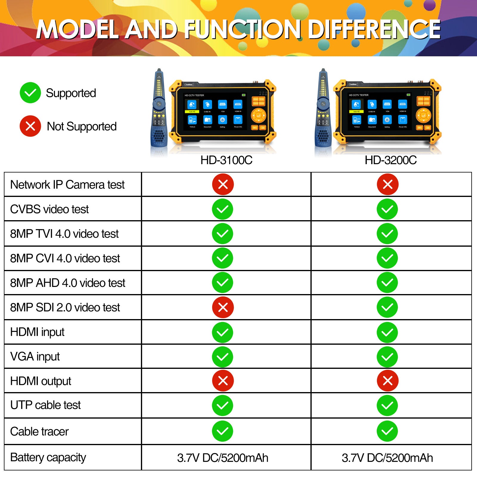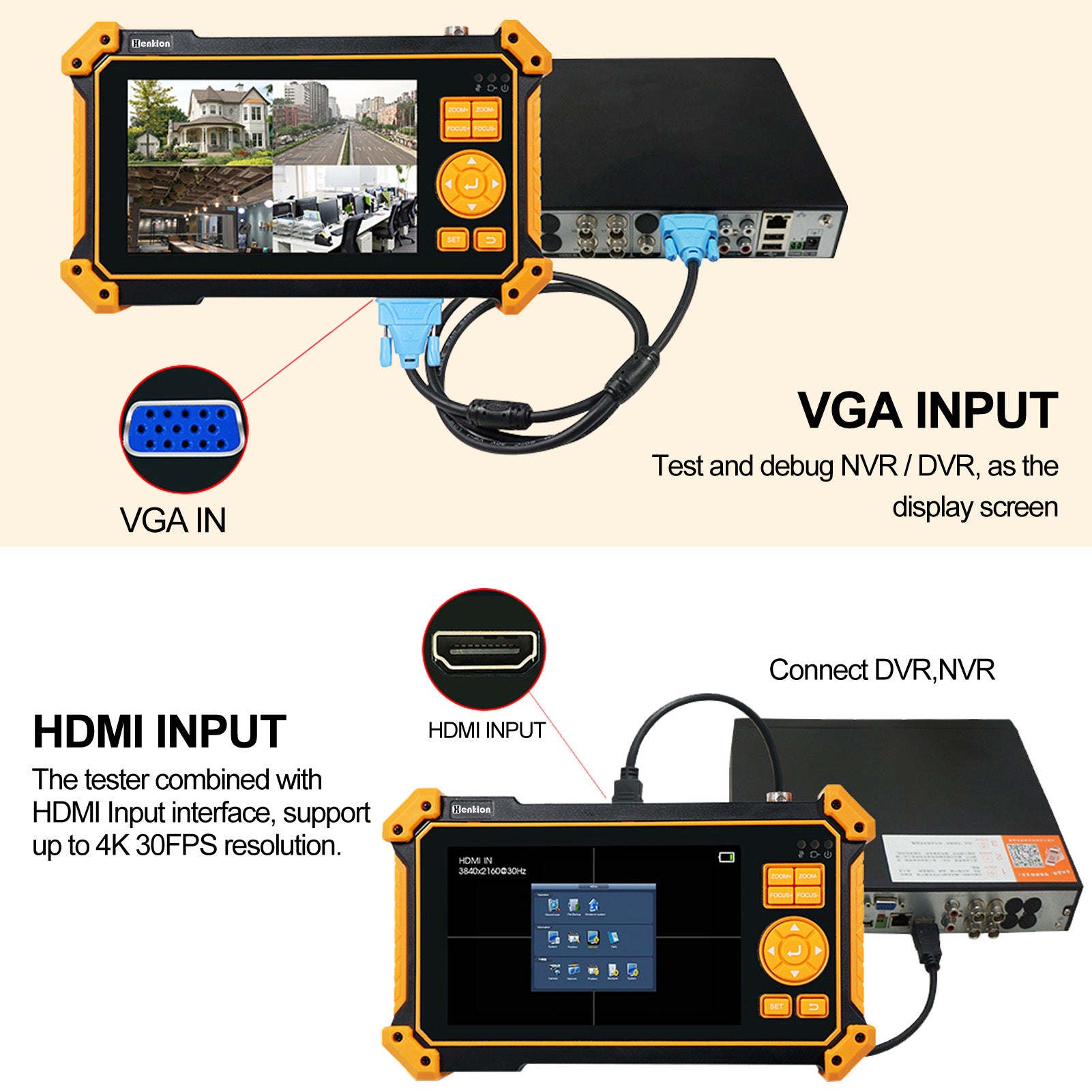 HD-3100C uses 5-inch TFT-LCD screen(Non-touch screen) and can support the testing of up to 4K 8MP HD CVI TVI AHD camera and CVBS cameras, but it does not support IP camera and SDI camera testing. Built-in professional test software, UTP cable test, PTZ controller, power output, HDMI&VGA input, audio input, and RS485 are all available. Using a self-developed operating system (based on Linux), work is stable and reliable. You can continue to view the details to learn more.