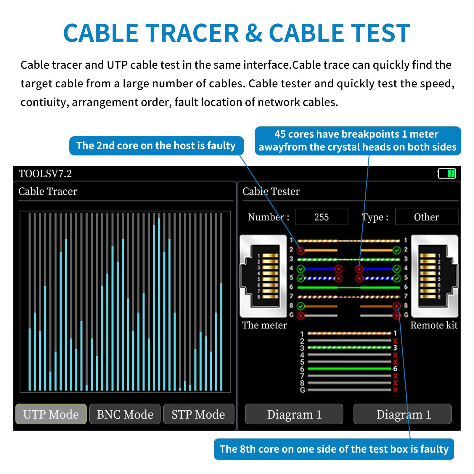 UTP cable test: Test UTP cable connection status and display on the screen. Can detect the near-end, mid-end and far-end fault point of the network cable crystal head. |
