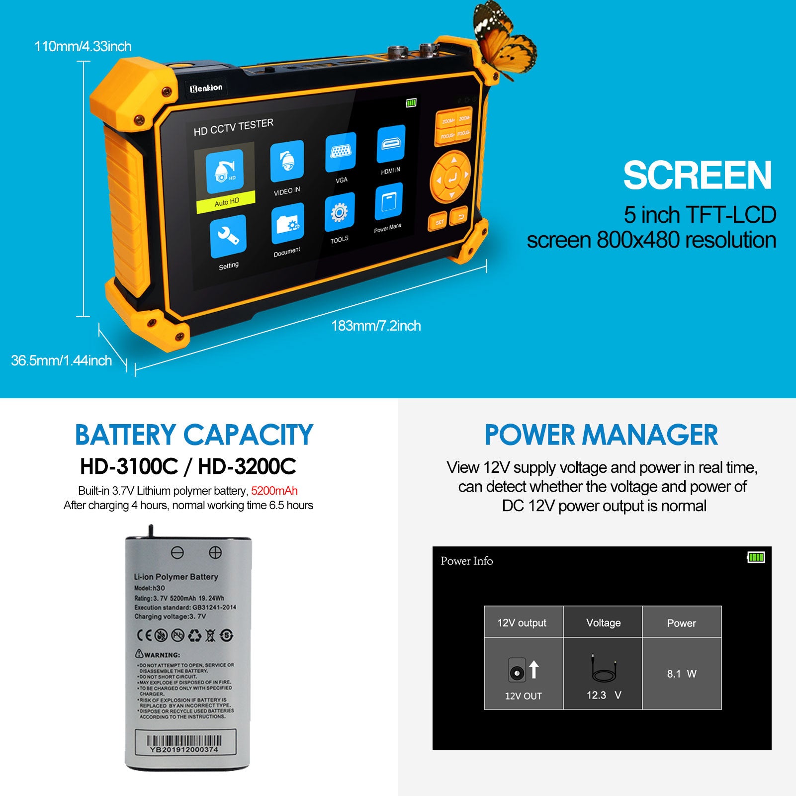 HD-3200 uses 5inch TFT-LCD screen(Non-touch screen), and can support the testing of up to 4K 8MP HD CVI TVI AHD SDI camera and CVBS cameras, but it does not support IP camera testing. Built-in professional test software, UTP cable test, PTZ controller, power output, HDMI&VGA input, audio input, and RS485 are all available. Using a self-developed operating system (based on Linux), work is stable and reliable. You can continue to view the details to learn more.