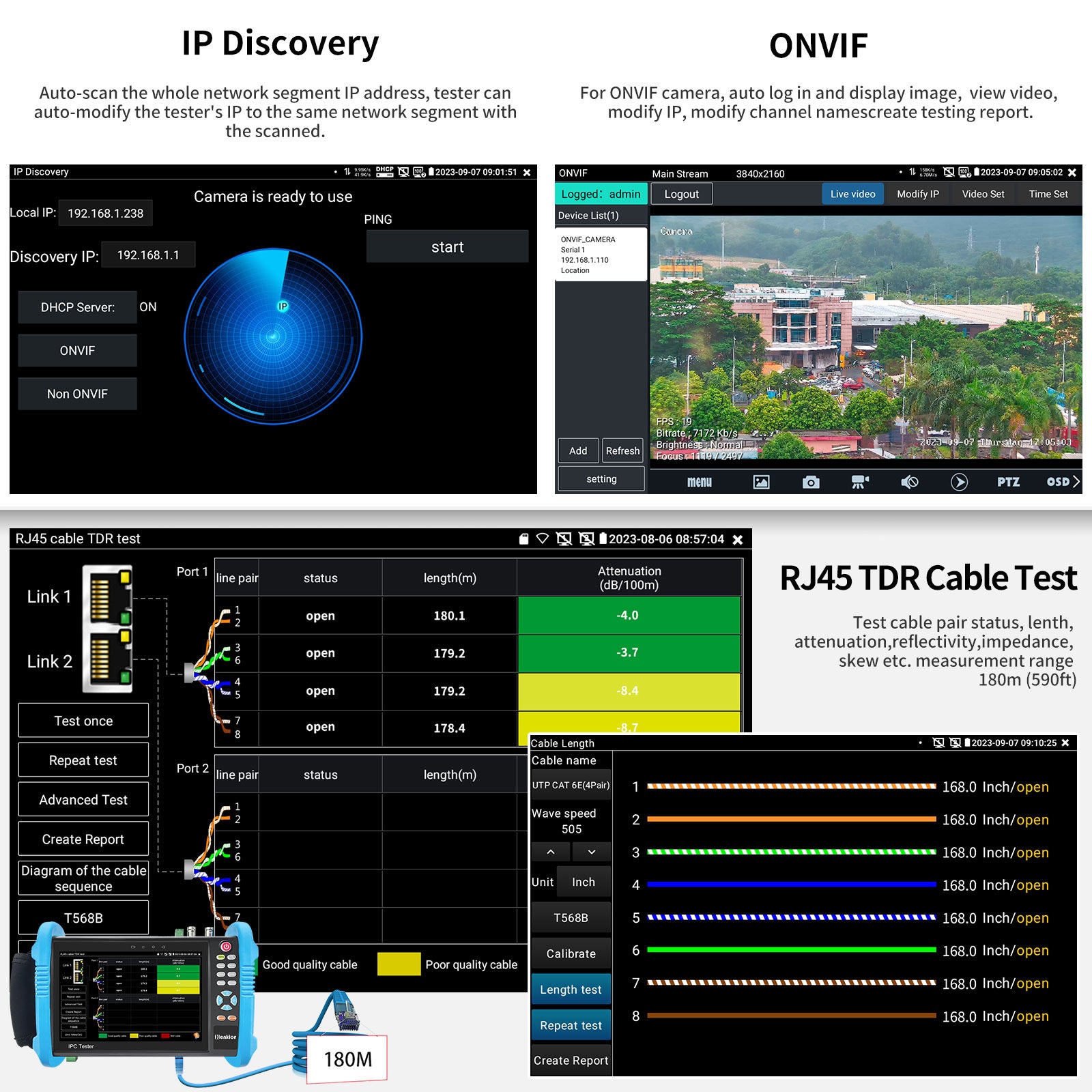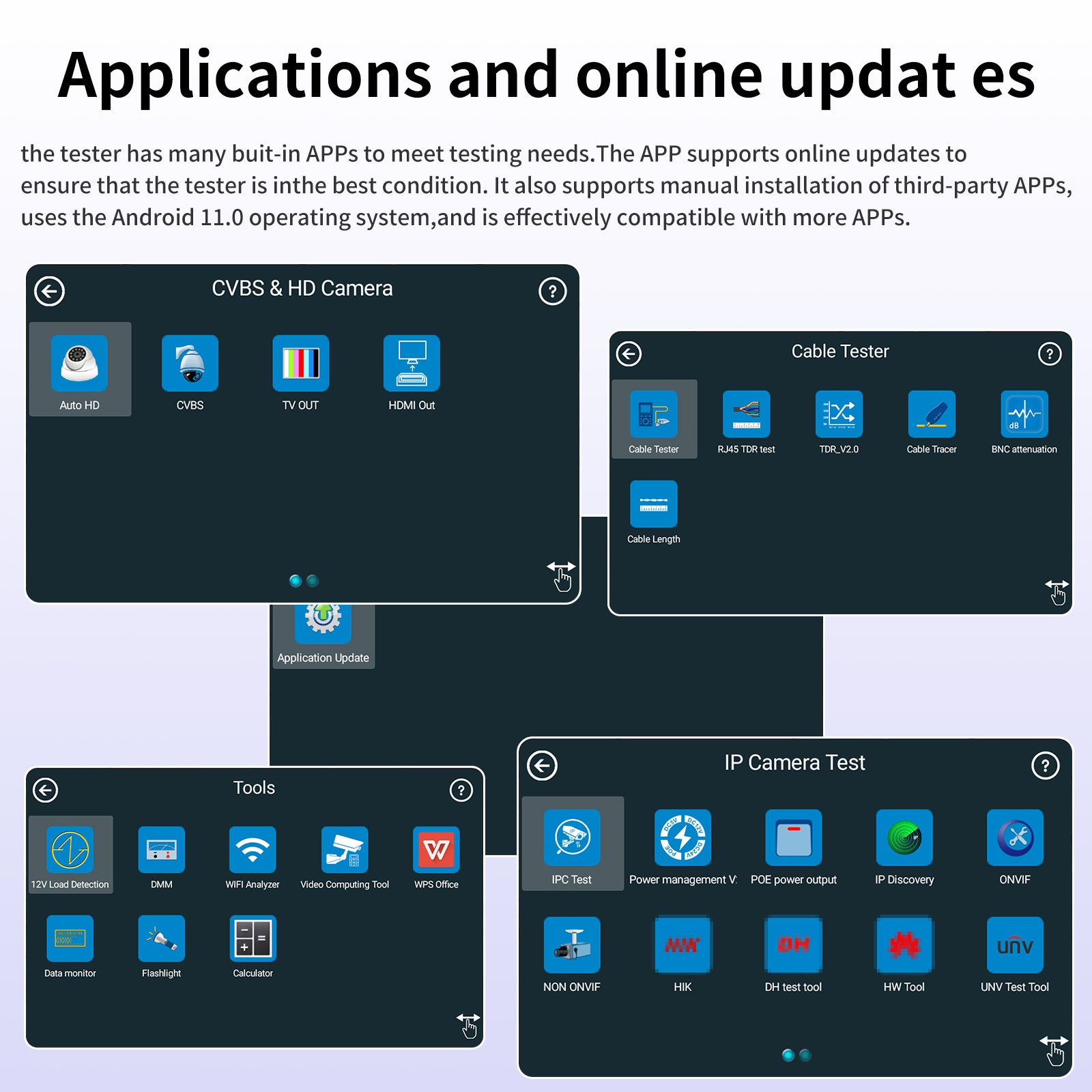 Although it is an entry-level tester of the IPC-9800 Pro series, in the context of the increasing popularity of IP cameras, it came into being. It has the latest Android 11.0 version. It can support the testing of 32MP IP cameras and CVBS cameras. It is the best choice when you only need to test the network camera. Professional test app, POE, WiFi, power output, HDMI output, and RS485 are all available. But if you need to test HD CVI TVI AHD SDI cameras, please purchase another Higher level tester, it does not support testing these types of cameras. You can continue to view the details to learn more. If you need any help, you can contact us at SALES@RSRTENG.COM
