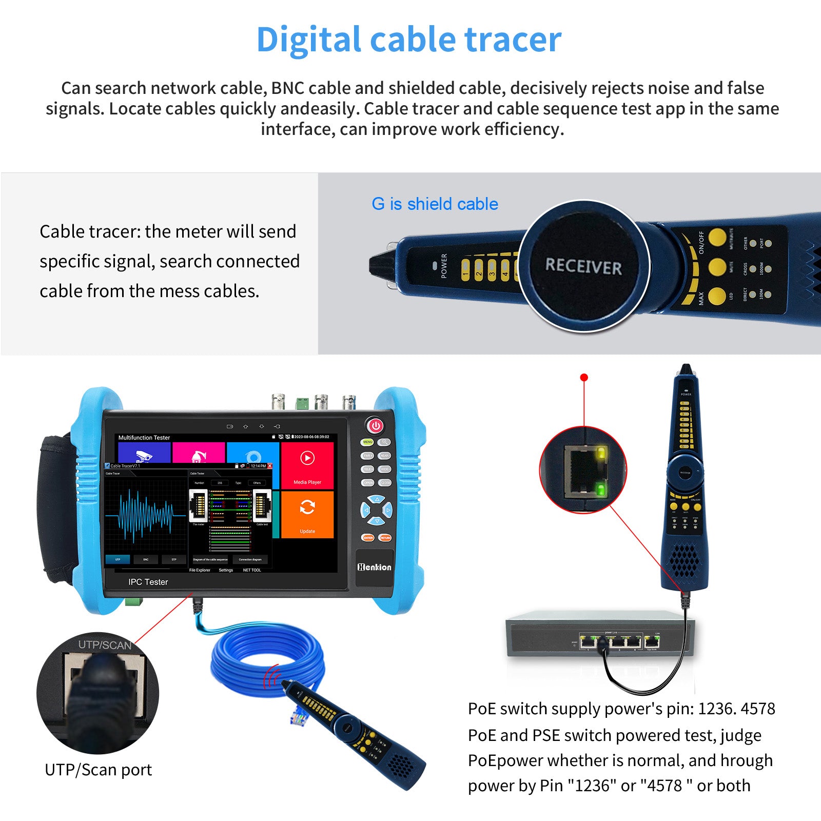 | Cable test | Cable tracer(Wire Finder):Contains a digital cable tracer. search BNC cable, network cable and telephone cable from the mess cables. Support AC voltage detector. voltage range: AC12V-1000V, Frequency: 50/60Hz, Alarm mode: sound and light double alarm, Safety class: CAT.III 1000V / CAT.IV 600V, CE |