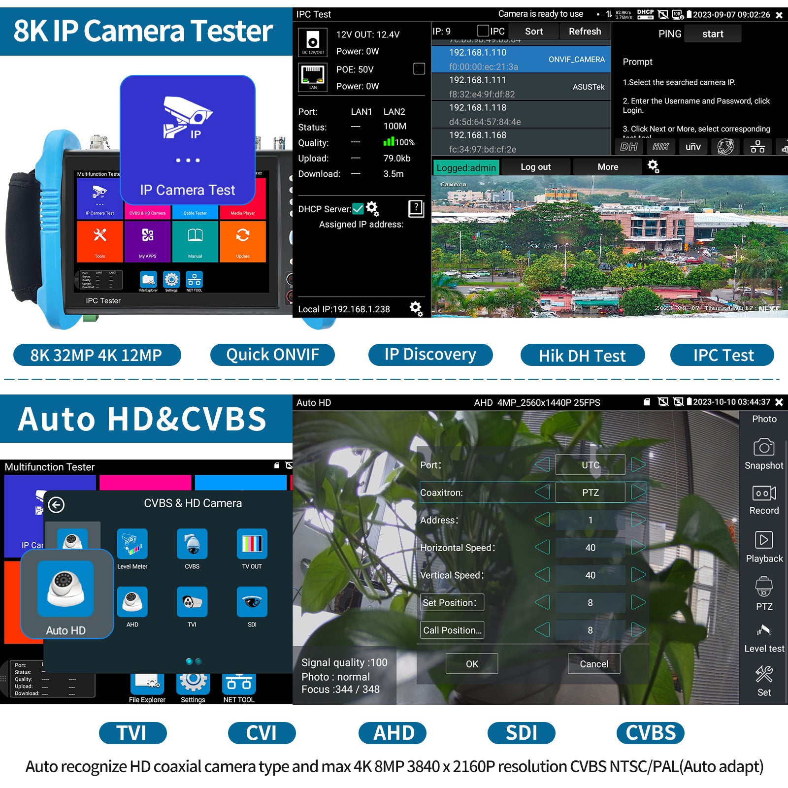 This is Henkion IPC-9800MOVTADHS Pro cost-effective 8K security surveillance camera tester. It is an essential tool for field technicians in the field of security cameras. Used for the installation and maintenance of IP network camera HD CVI TVI AHD SDI camera and CVBS camera.