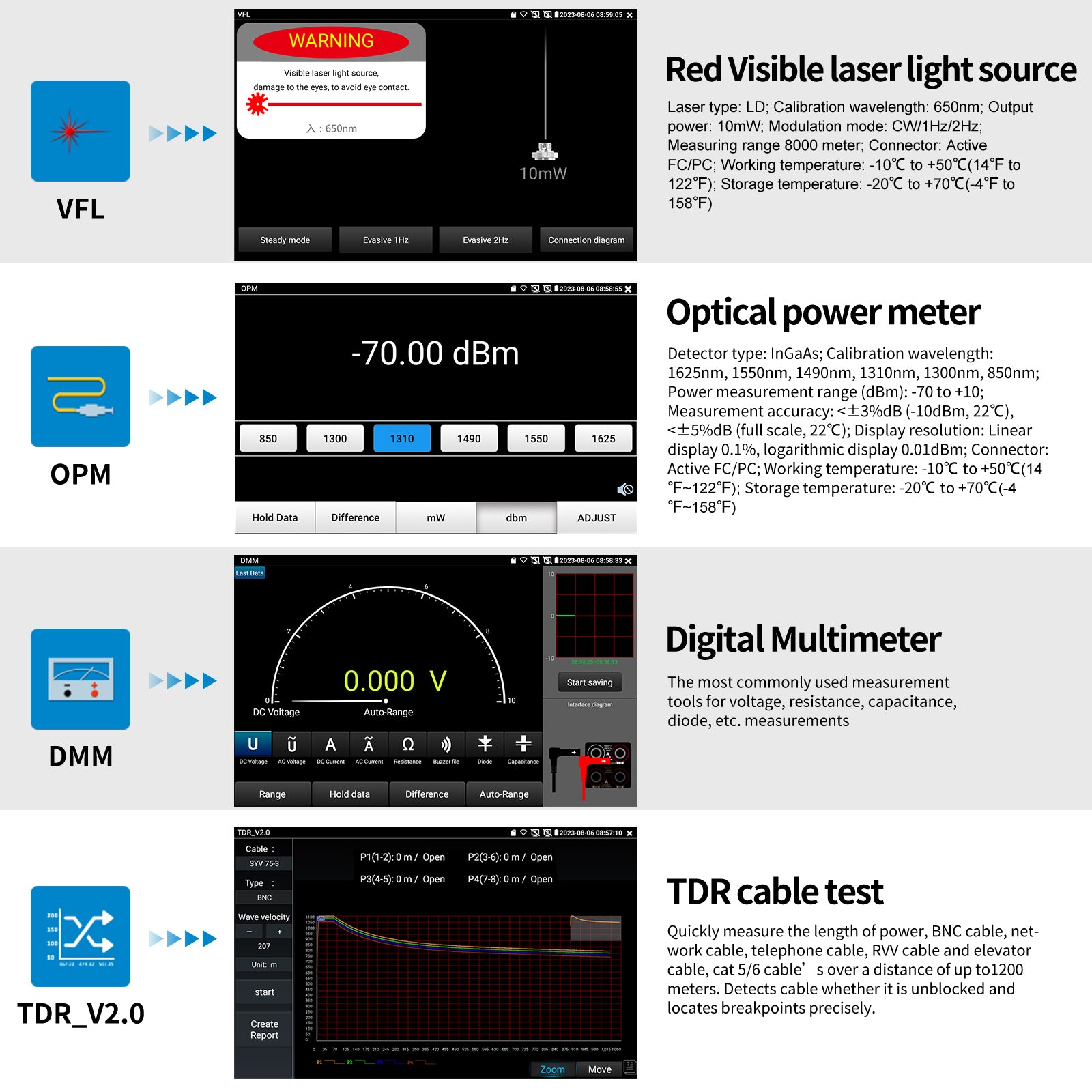 | TDR cable test (hardware support) | Measurable cable type: metal cable, include BNC cable, network cable, telephone cable, RVV cable and elevator cable, cat 5/6 cable’s length and short circuit. measurement range 1,200m(3,937 ft) | ||