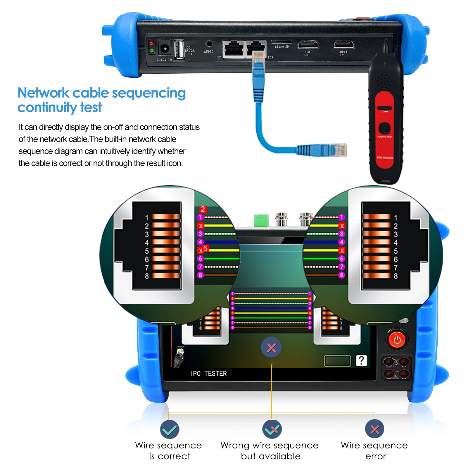 Support Analog CVBS camera test, NTSC/PAL (Auto adapt). PTZ control, RS485 control, Baud 600-115200bps, compatible with more than 30 protocols. Such as PELCO-D/P etc.