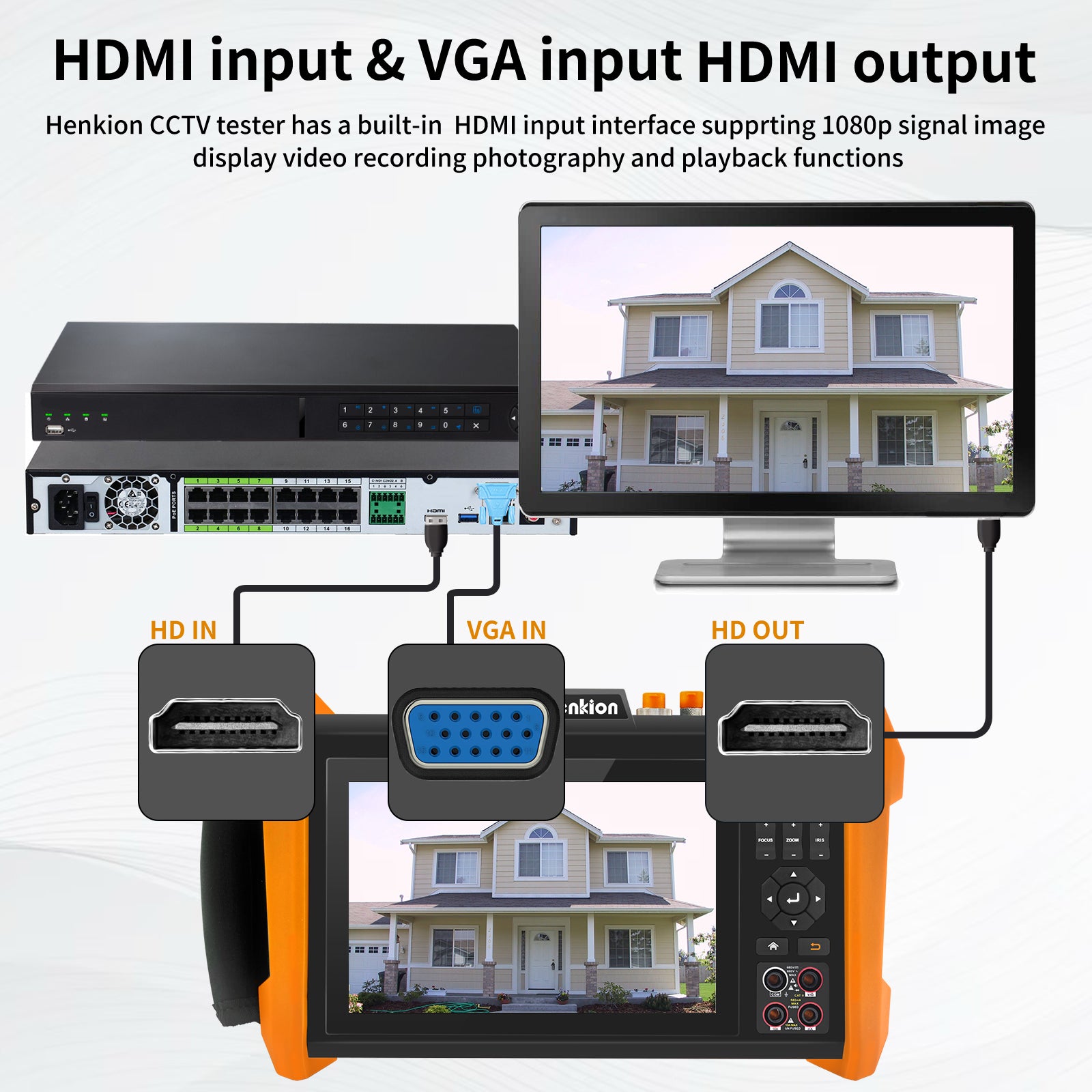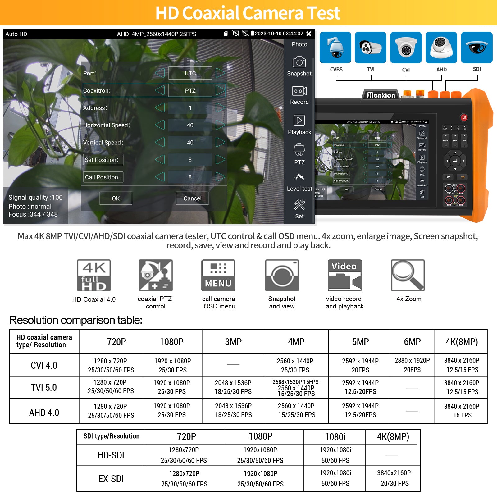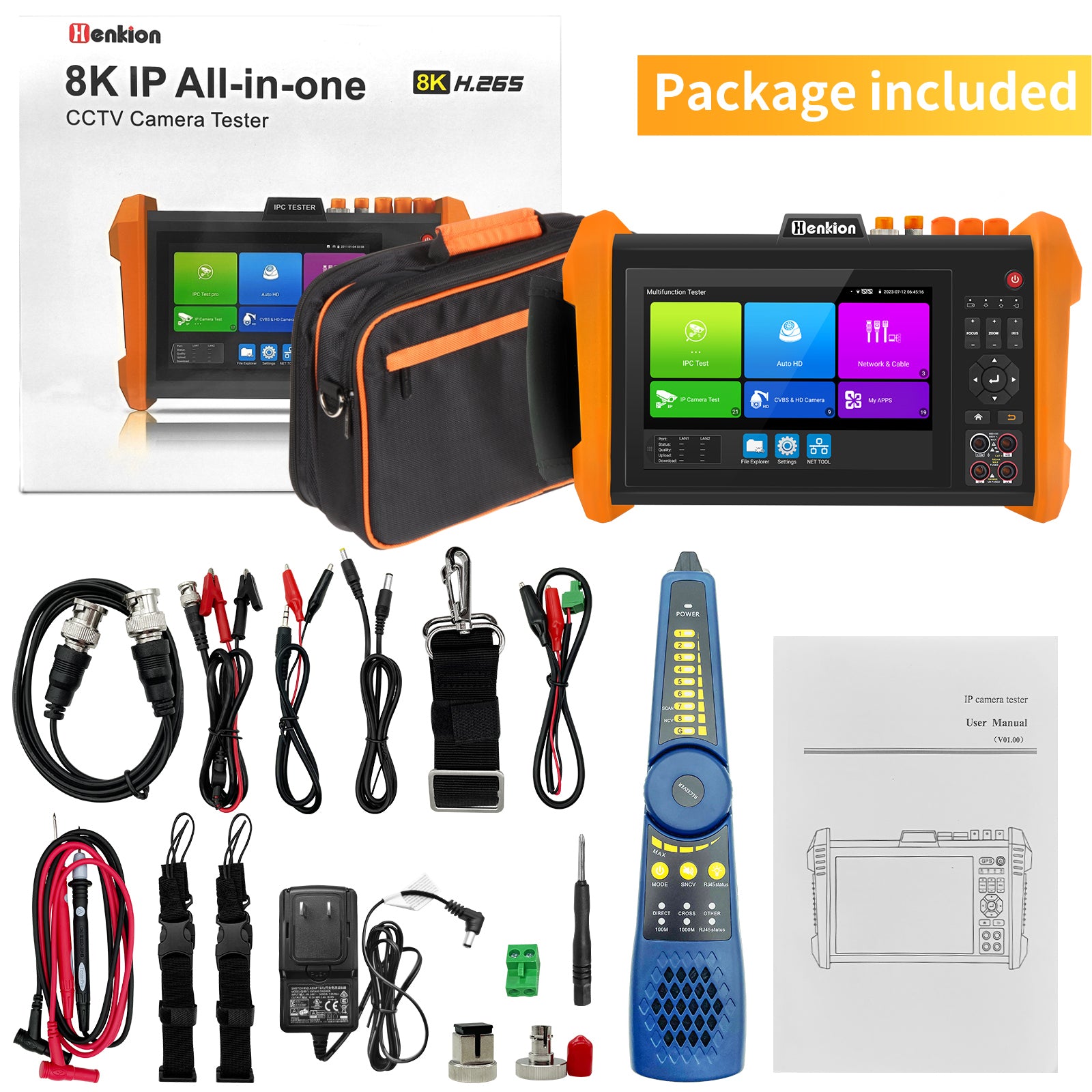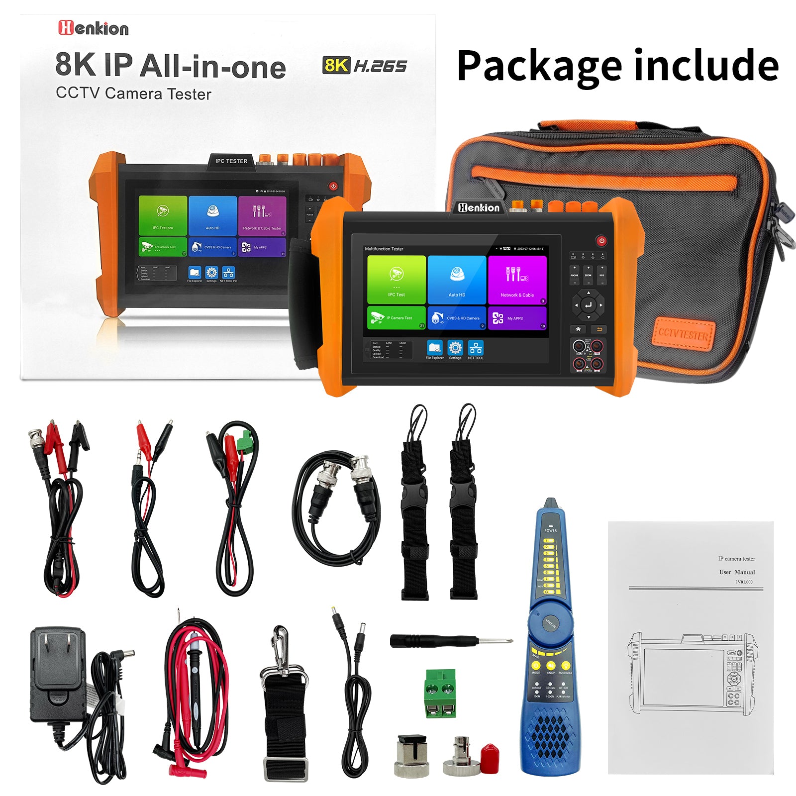 The Henkion 7-inch IPS touch screen IP camera tester is designed for maintenance and installation of new analog, HD coaxial cameras as well as other security equipment, 8K 32MP video display via mainstream. The unit supports many ONVIF PTZ and analog PTZ control. Additionally, it with other functions like TDR cable test, Optical power meter, Visual fault locator, UTP cable test cable tracer, etc.