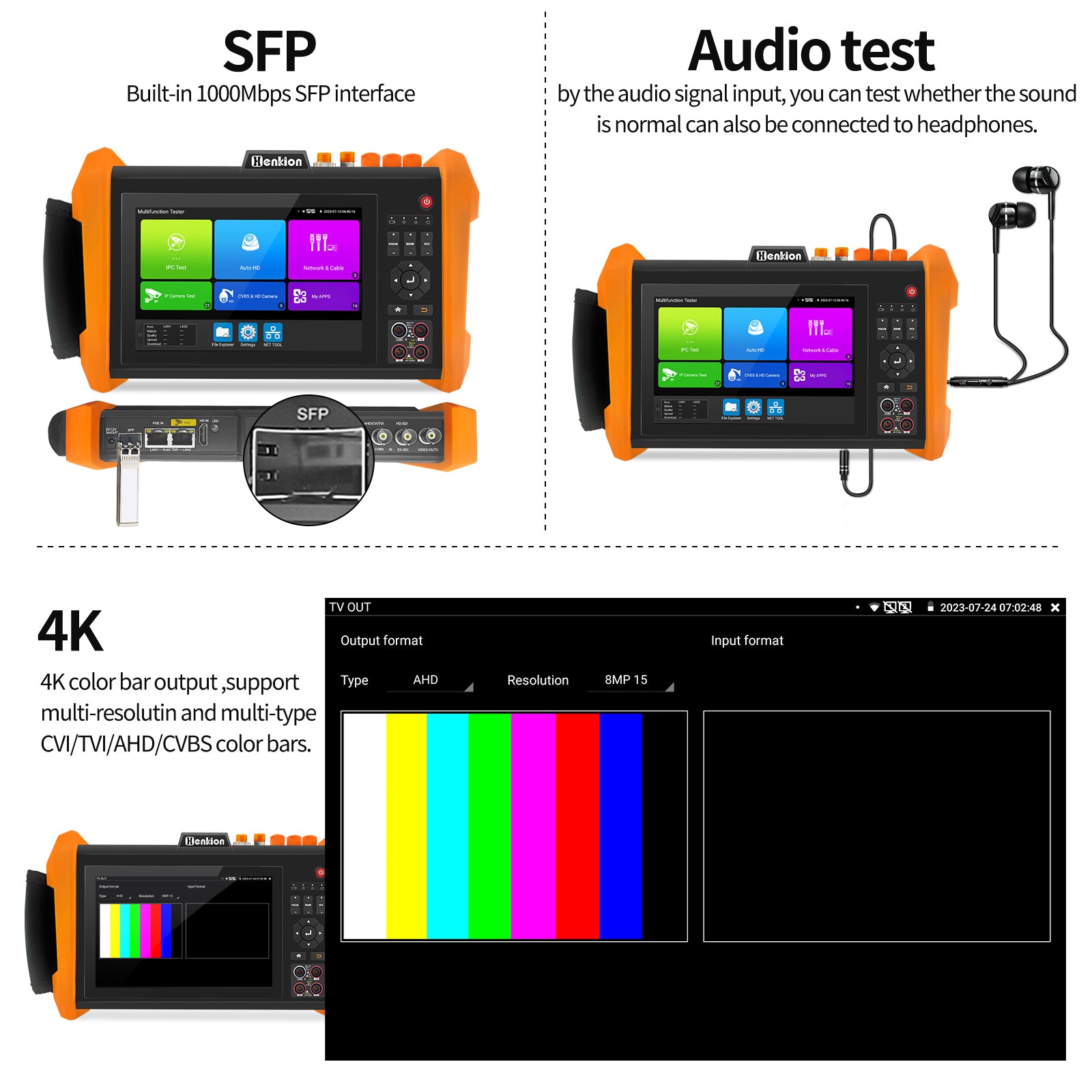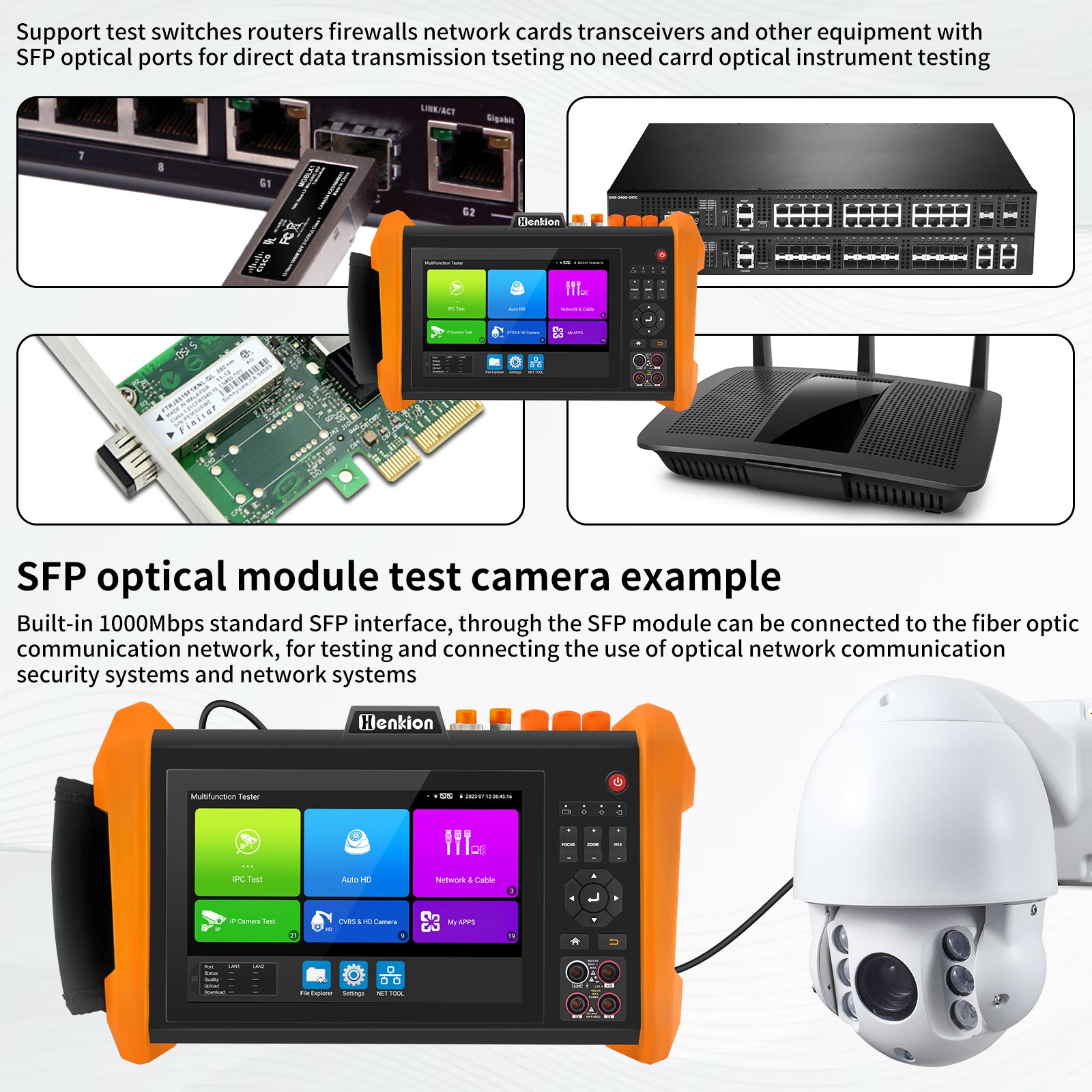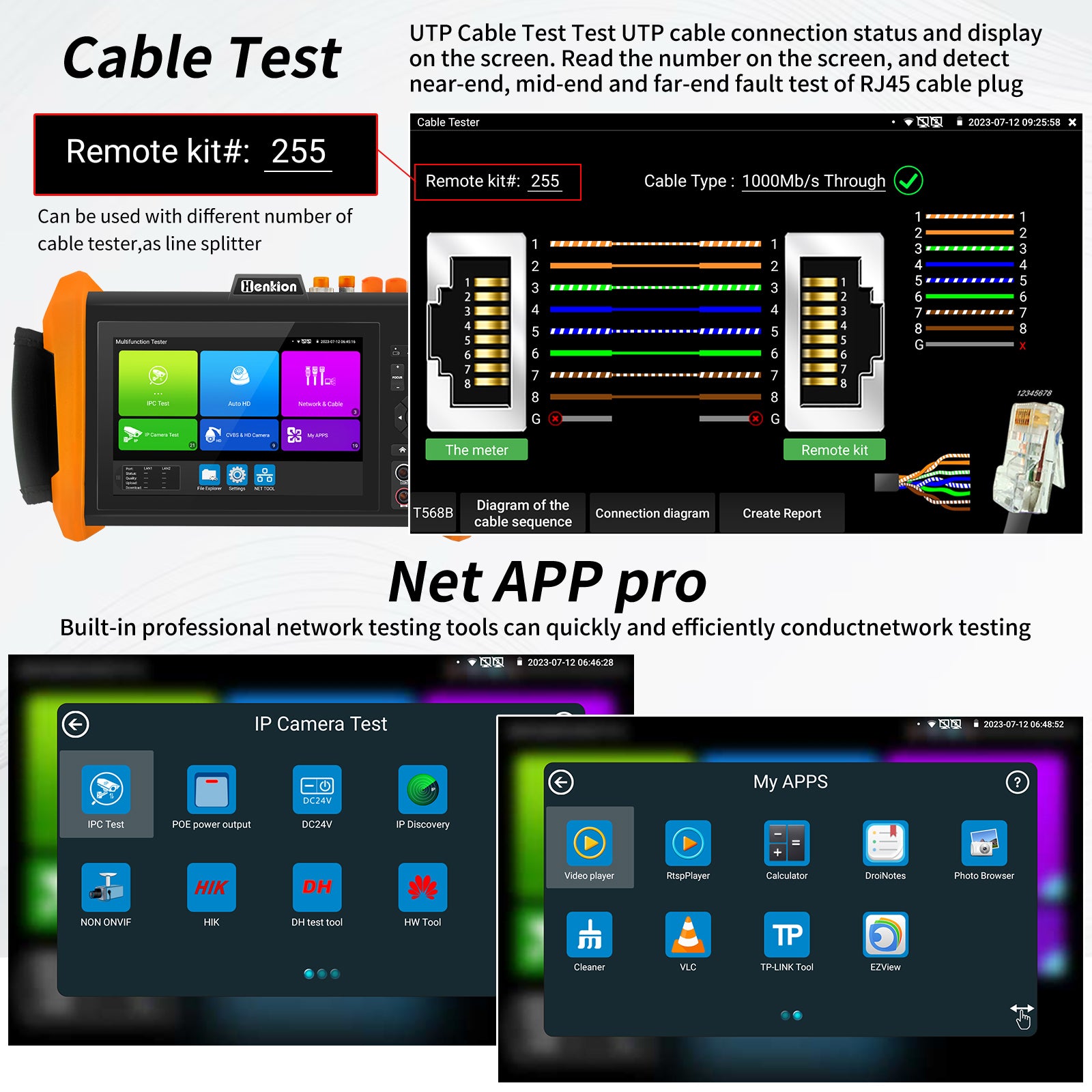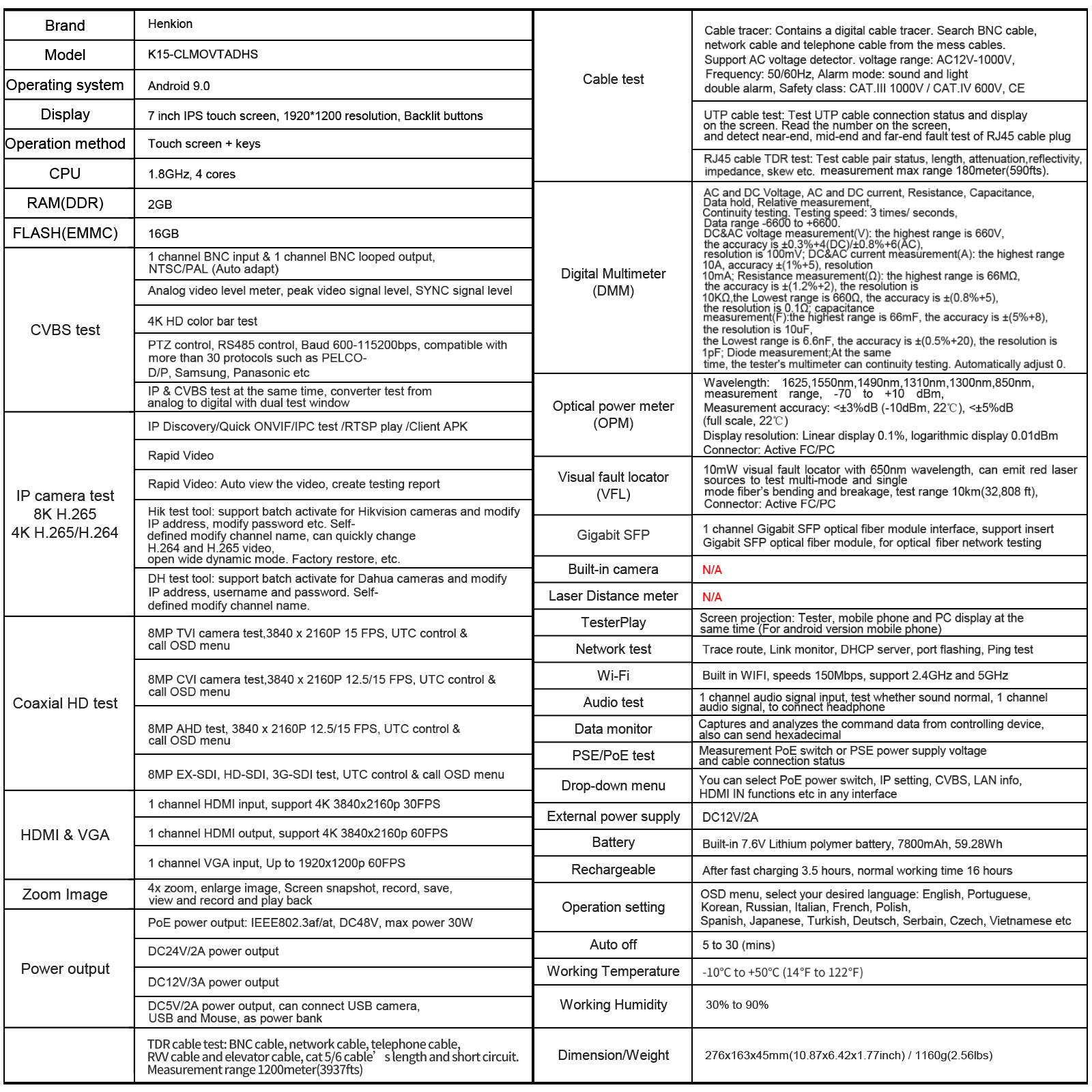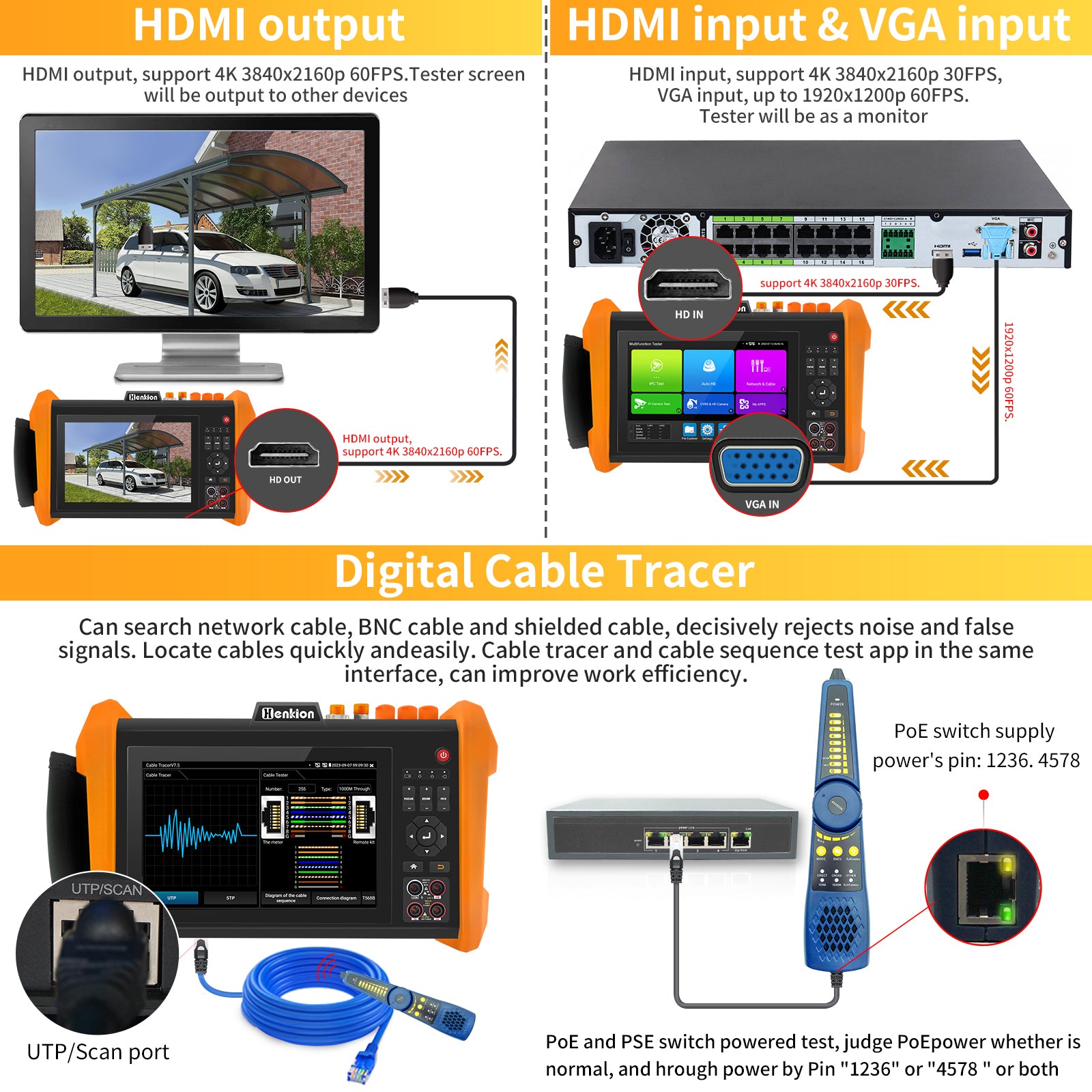 The Henkion 7-inch IPS touch screen IP camera tester is designed for maintenance and installation of new analog, HD coaxial cameras as well as other security equipment, 8K 32MP video display via mainstream. The unit supports many ONVIF PTZ and analog PTZ control. Additionally, it with other functions like TDR cable test, Optical power meter, Visual fault locator, UTP cable test cable tracer, etc.