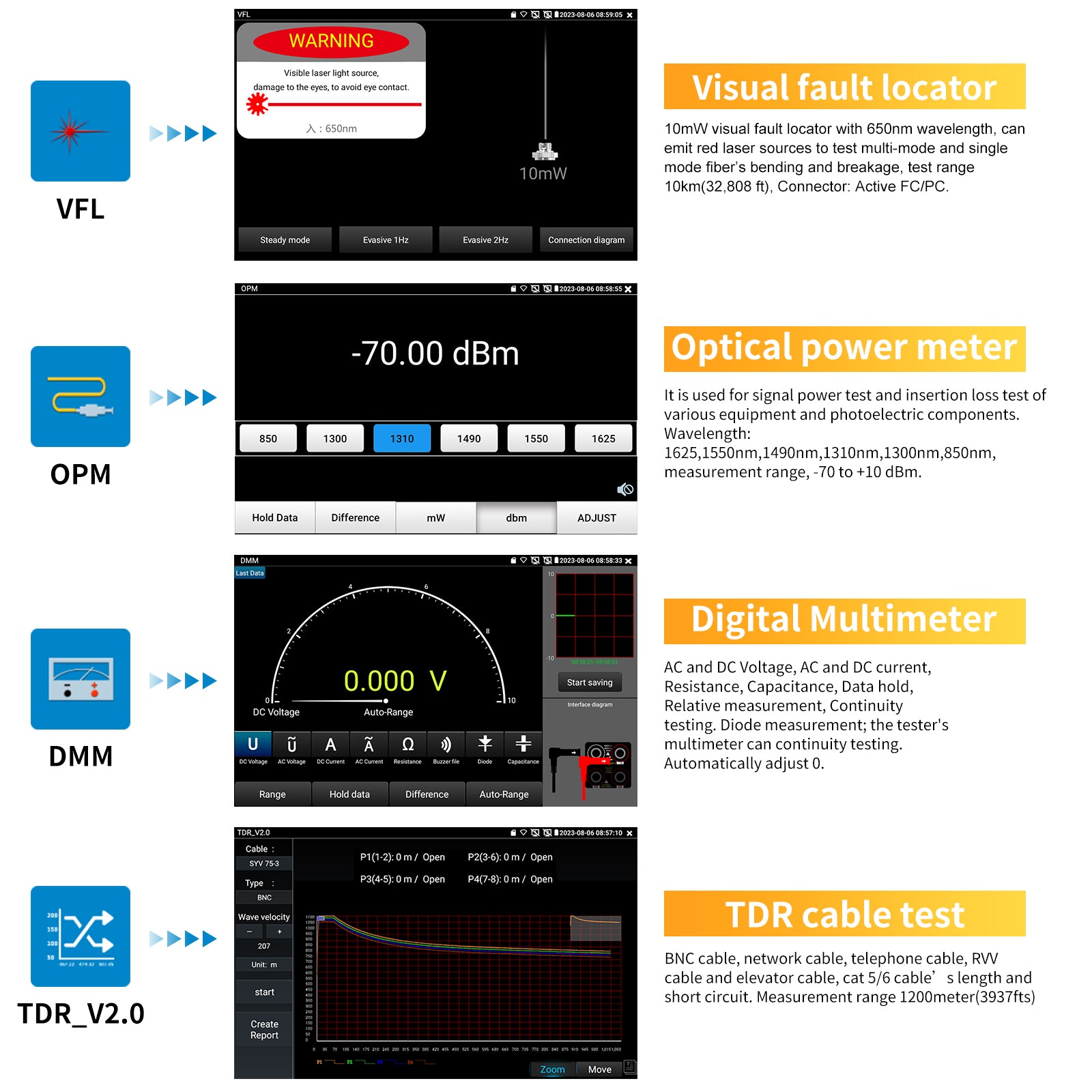 | Cable test | TDR cable test: BNC cable, network cable, telephone cable, RVV cable and elevator cable, cat 5/6 cable’s length and short circuit. Measurement range 1200meter(3937fts) |
