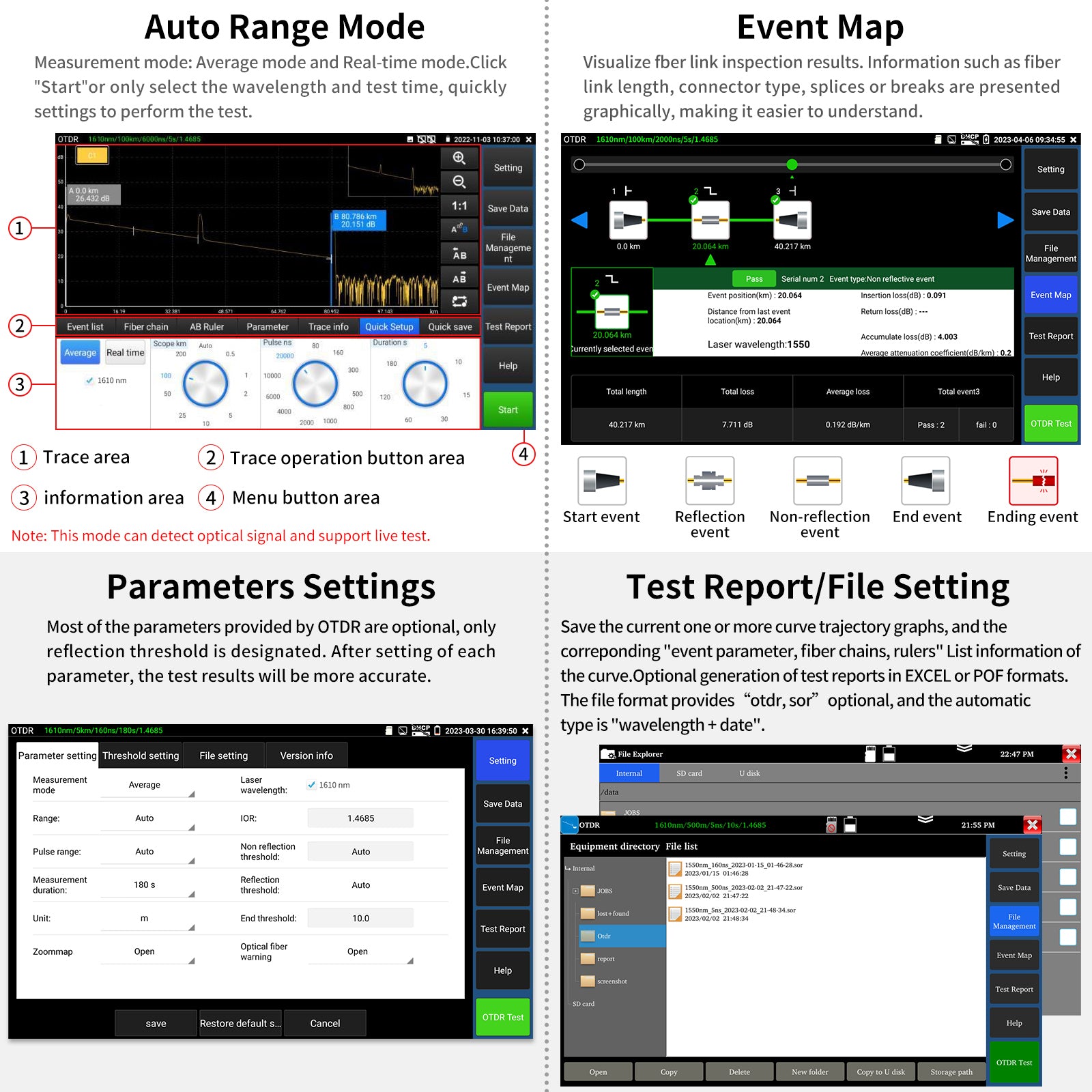 The OTDR fiber tester can analyze the curve automatically, touch screen zoom, or move curves operation. The tested results are displayed in the form of a list. Event list clearly reflects the type of event, distance, loss, decay, and reflection. Shortest event dead zone (1.6m) and attenuation dead zone (8m). Save the current one or more curve trajectory graphs, and create trace reports to the storage path.SOR standard file format PDF/EXCEL.