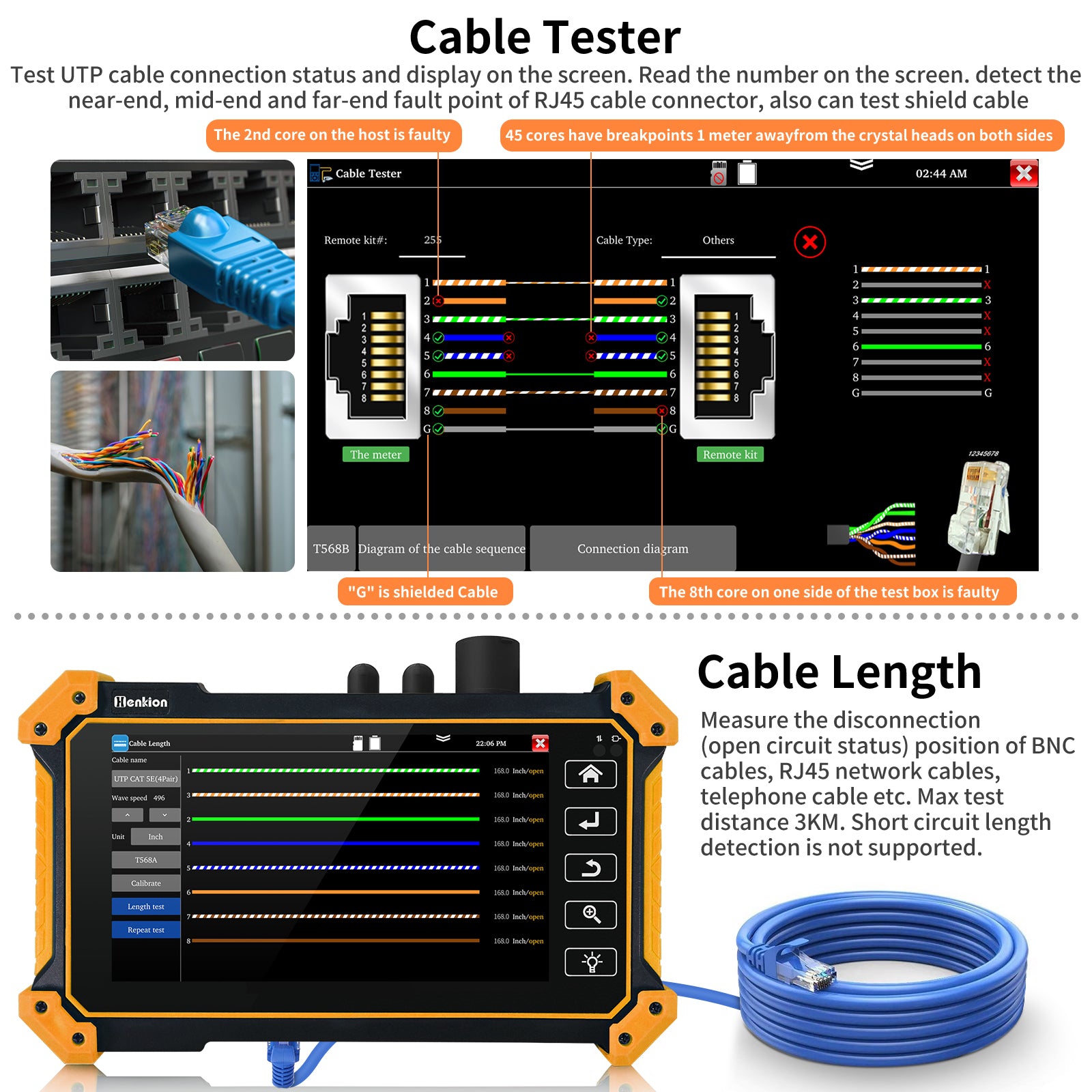 | Cable length test | Measure the disconnection (open circuit status) position of BNC cables, RJ45 network cables, telephone cable etc. Max test distance 3KM. Short circuit length detection is not supported. | ||