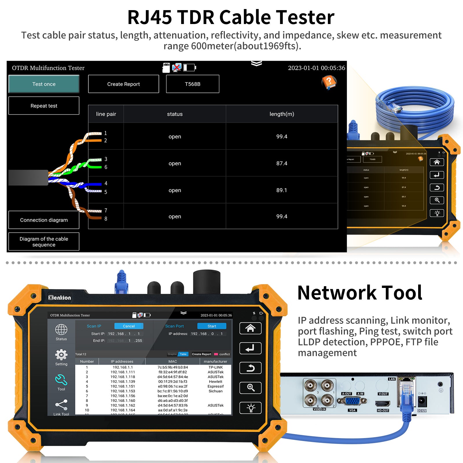 | RJ45TDR cable test | Test cable pair status, length, attenuation, reflectivity, and impedance, skew etc. measurement range 600meter(about1969fts). | ||