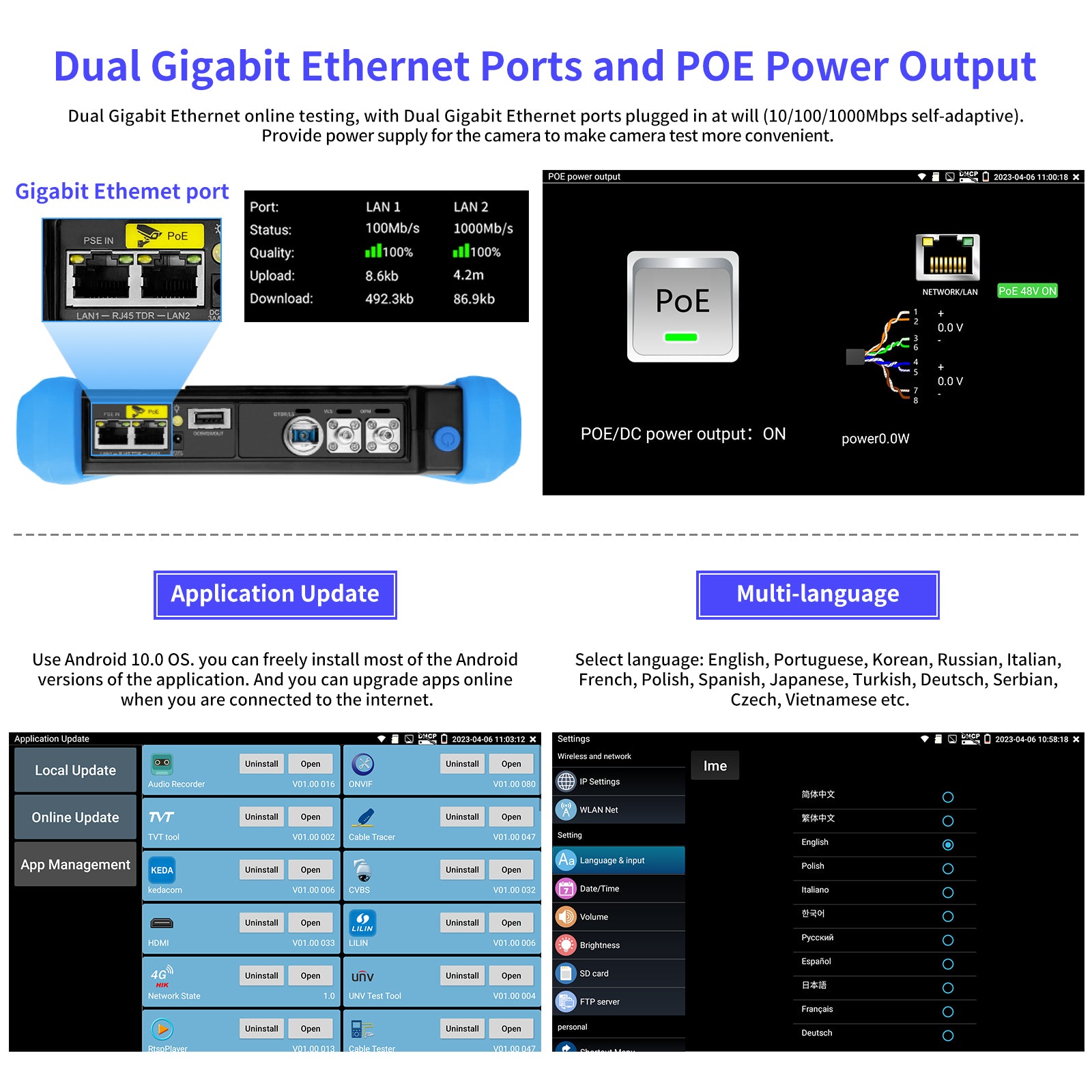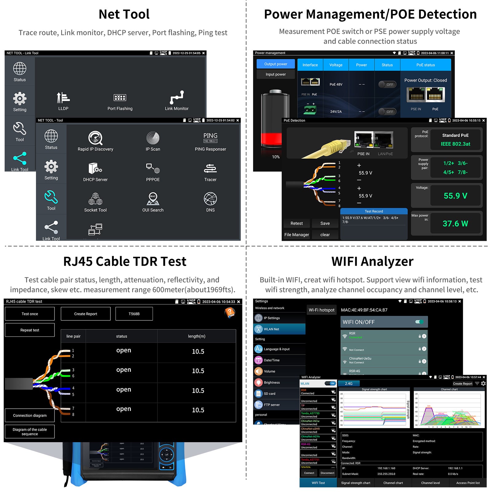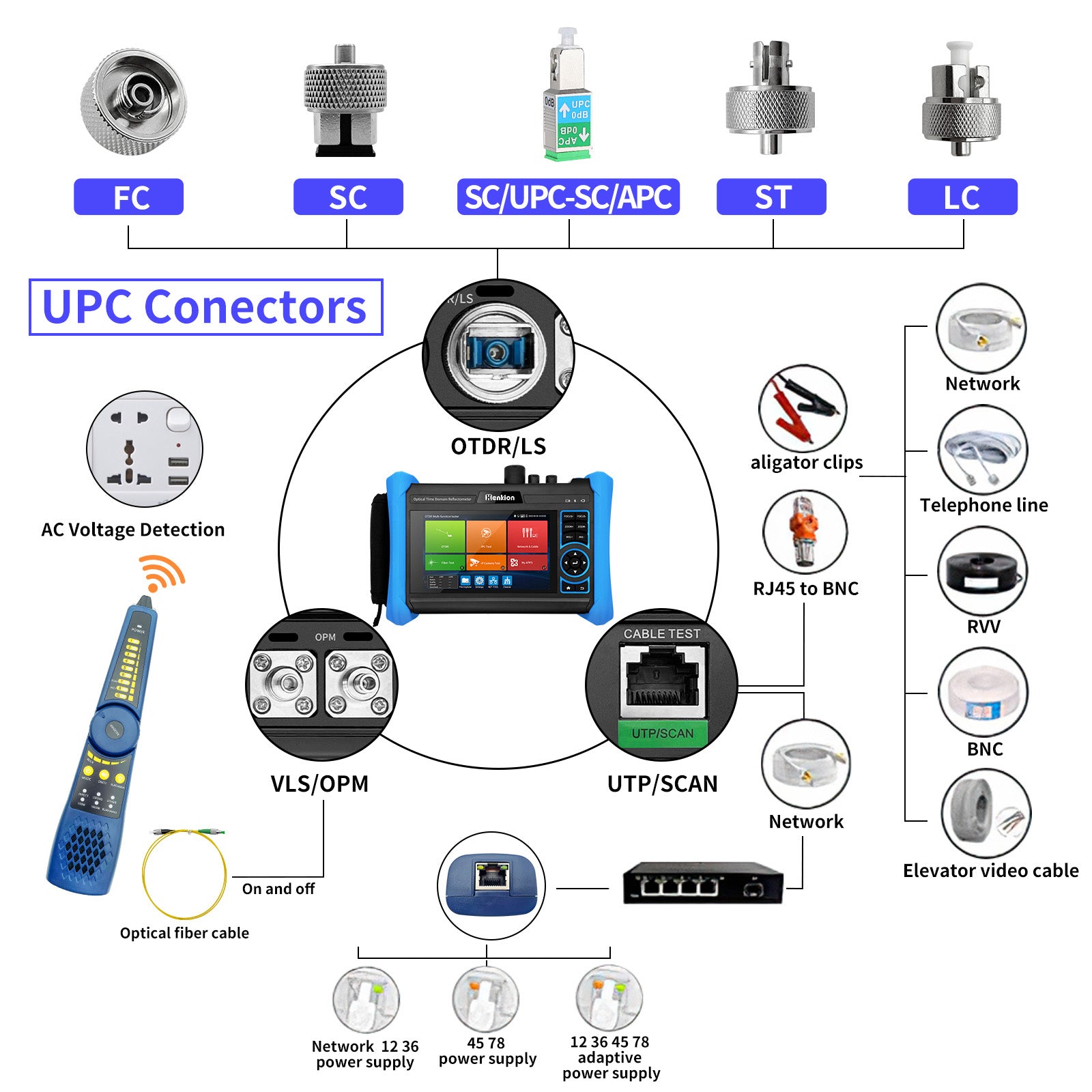 OTDR multi-function tester integrating OTDR test, event map, LS, OLS, OPM, VLS, 8K IPC test, cable test, cable tracer, network test and other camera test tools, dual Gigabit Ethernet 10/100/1000M Ports, 2.4Ghz WiFi(Not 5G), 8GB TF card, POE, RS485, HDMI output, audio I/O, etc.