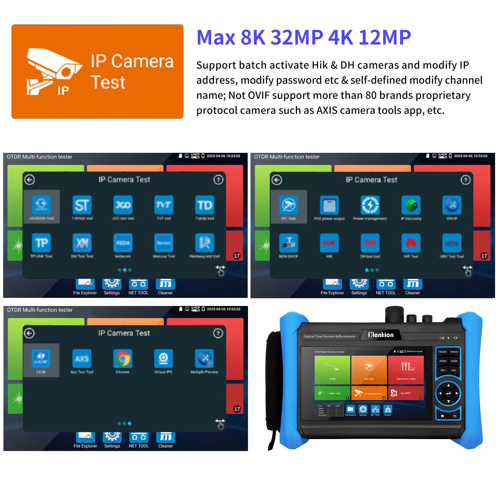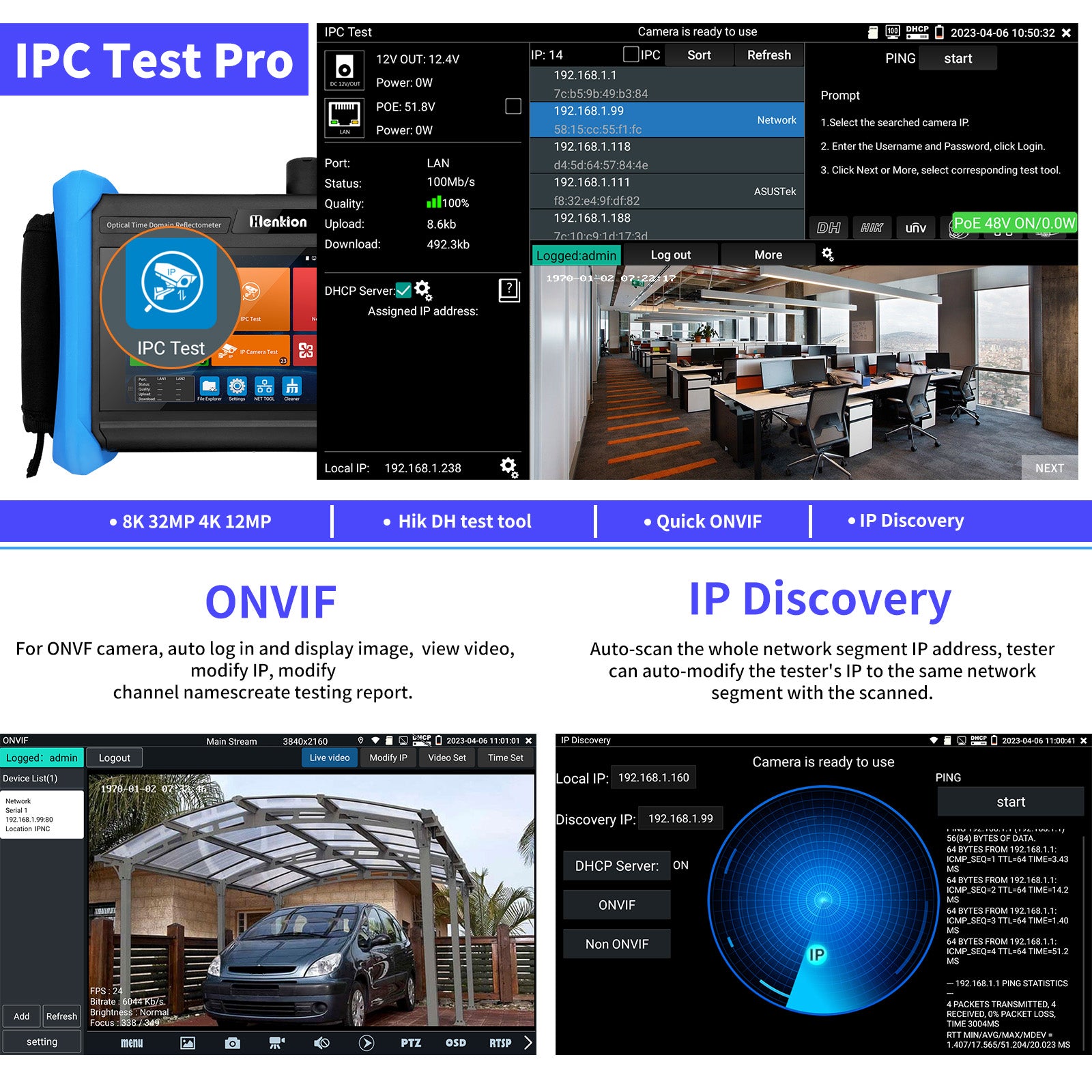 | IP camera test | Support max 8K 32MP 8160x3616 24fps video display via mainstream. For Onvif camera, view video, modify IP, modify channel names, support create test reports. | |||||