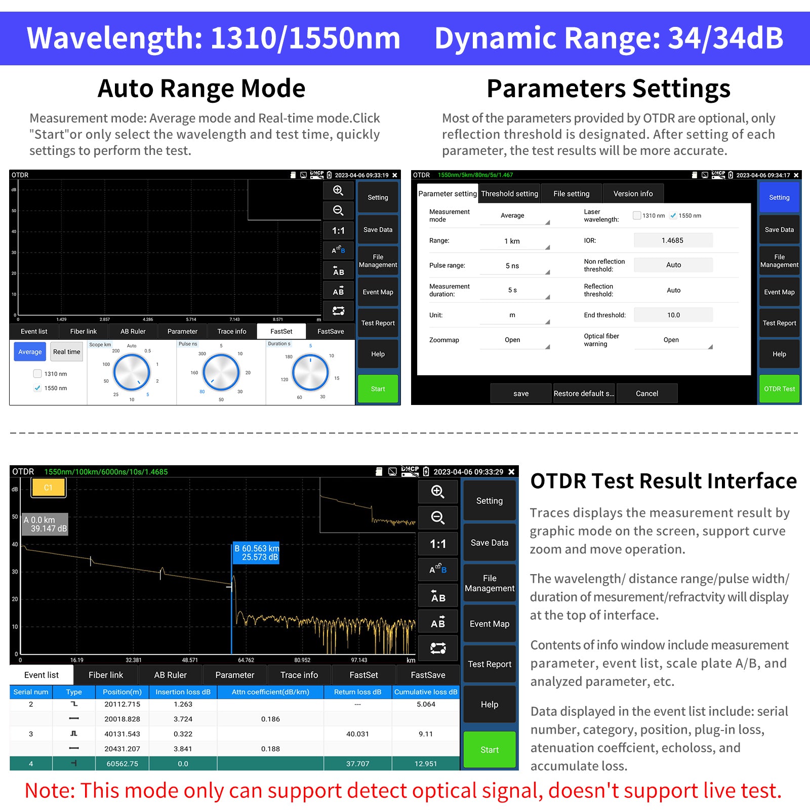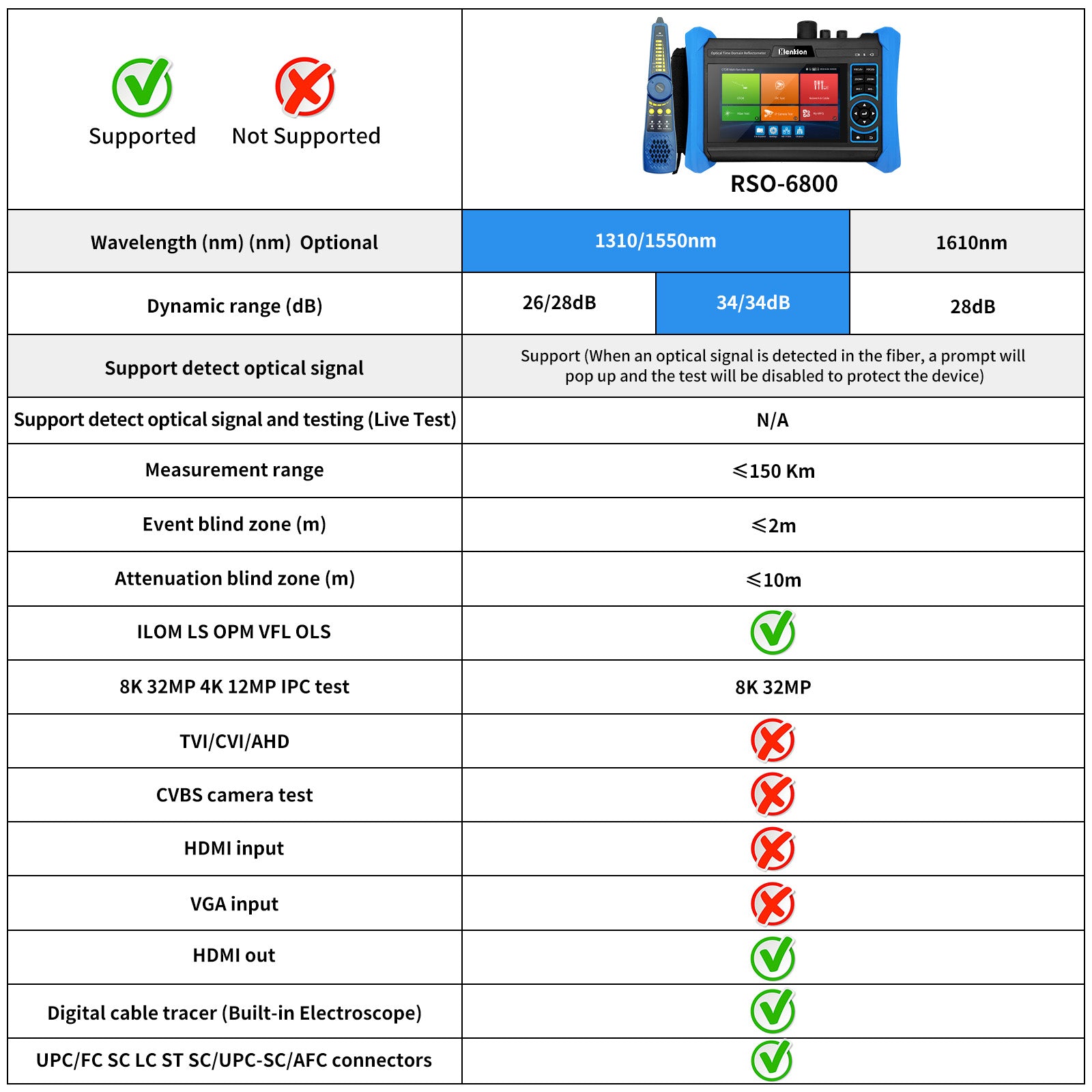 | Support detect optical signal | Support (When an optical signal is detected in the fiber, a prompt will pop up and the test will be disabled to protect the device) | N/A | ||||