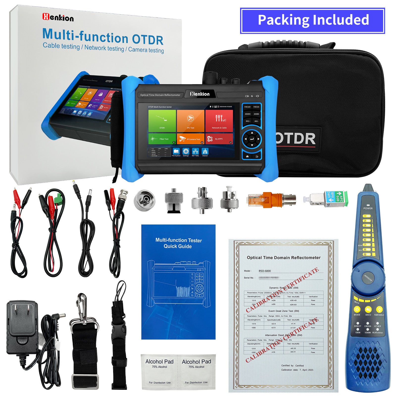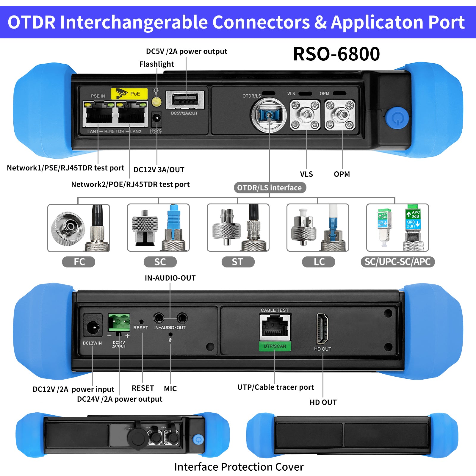 The RSO-6800 OTDR series is a multifunctional all-in-one fiber tester and camera tester. It supports testing of IP cameras up to 8K 32MP, HD coaxial cameras, and CVBS cameras, and supports multiple cable tests and OTDR fiber optical tests at the same time.