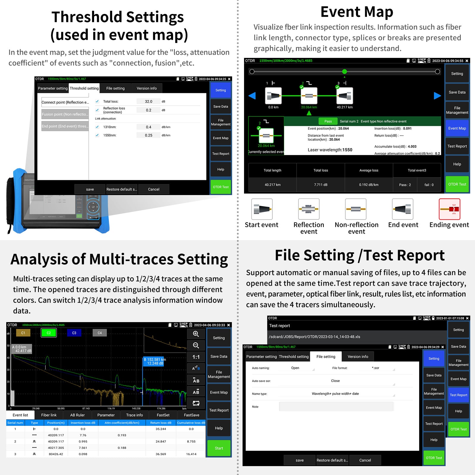 All-in-one OTDR fiber tester tool will make your work process simple and efficient. This OTDR fiber tester can analyze the curve automatically, touch screen zoom, or move curves operation. The tested results are displayed in the form of a list.