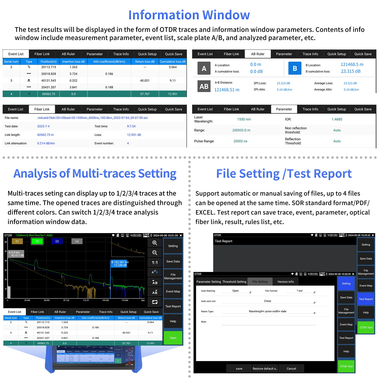 The OTDR fiber tester can analyze the curve automatically, touch screen zoom, or move curves operation. The tested results are displayed in the form of a list. Event list clearly reflects the type of event, distance, loss, decay, and reflection. Shortest event dead zone (1.6m) and attenuation dead zone (8m). Save the current one or more curve trajectory graphs, and create trace reports to the storage path. SOR standard file format PDF/EXCEL.