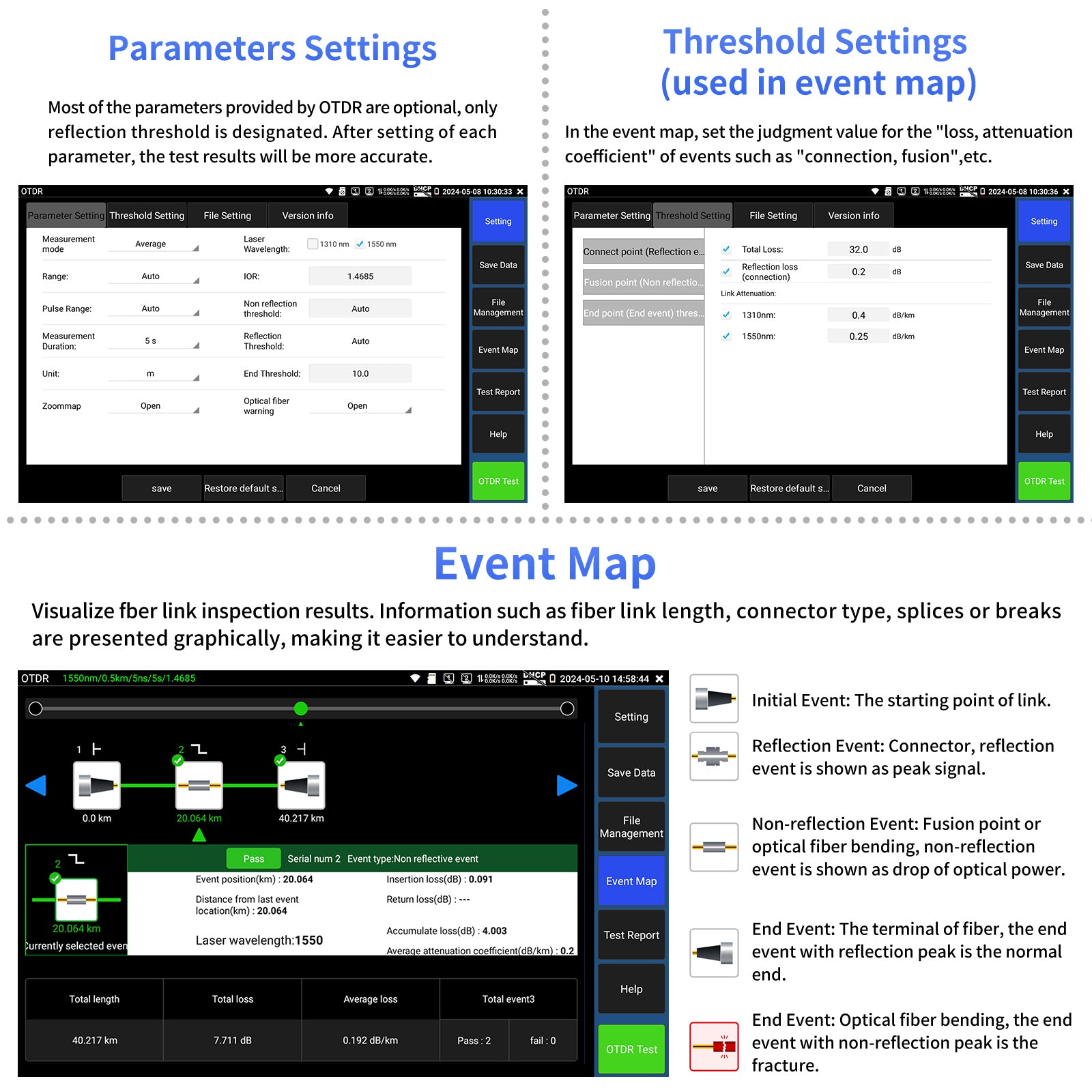 For parameters setting mode: Testing after setting parameters distance scope, pulse width, duration of measurement, etc. Curvest/map are displayed simultaneously.