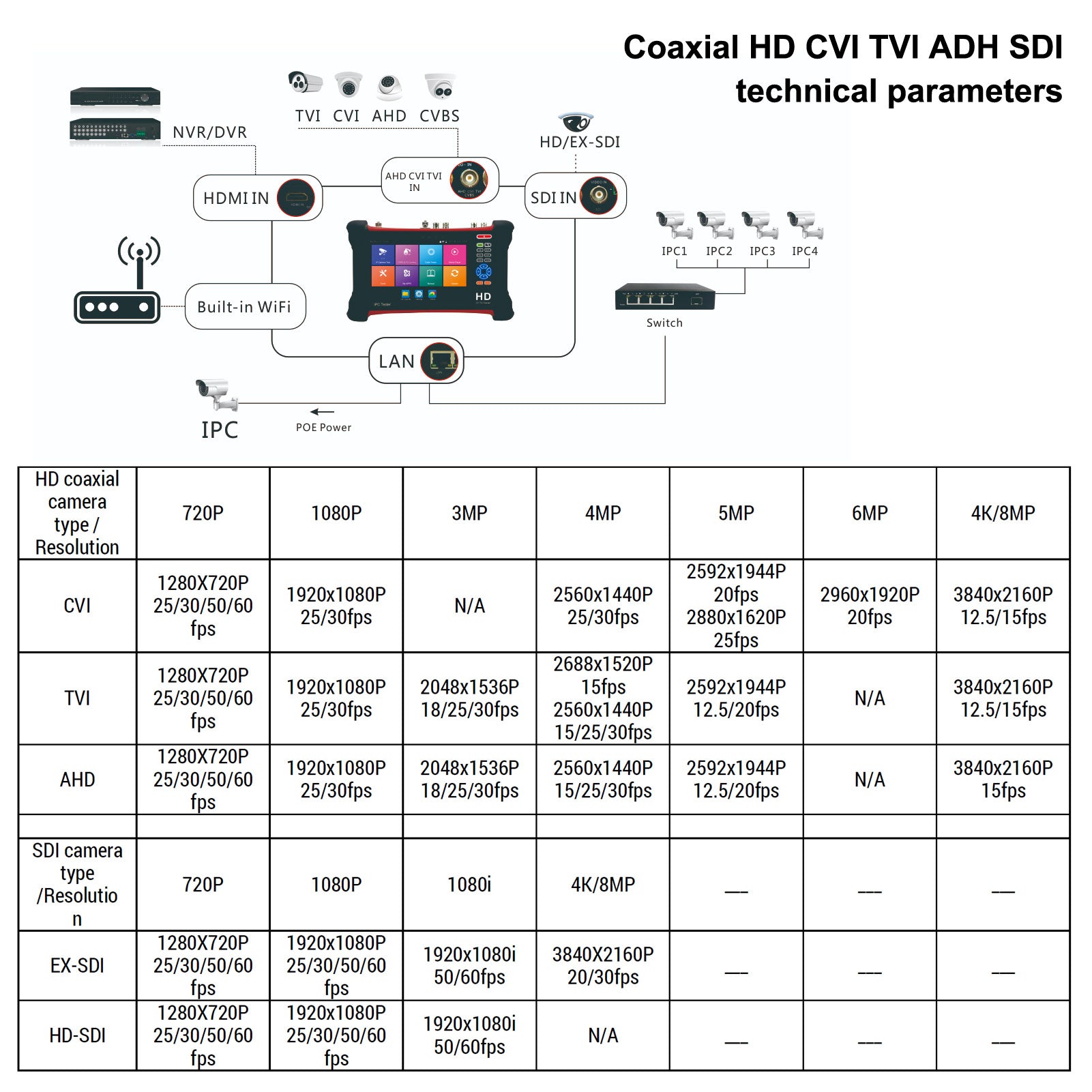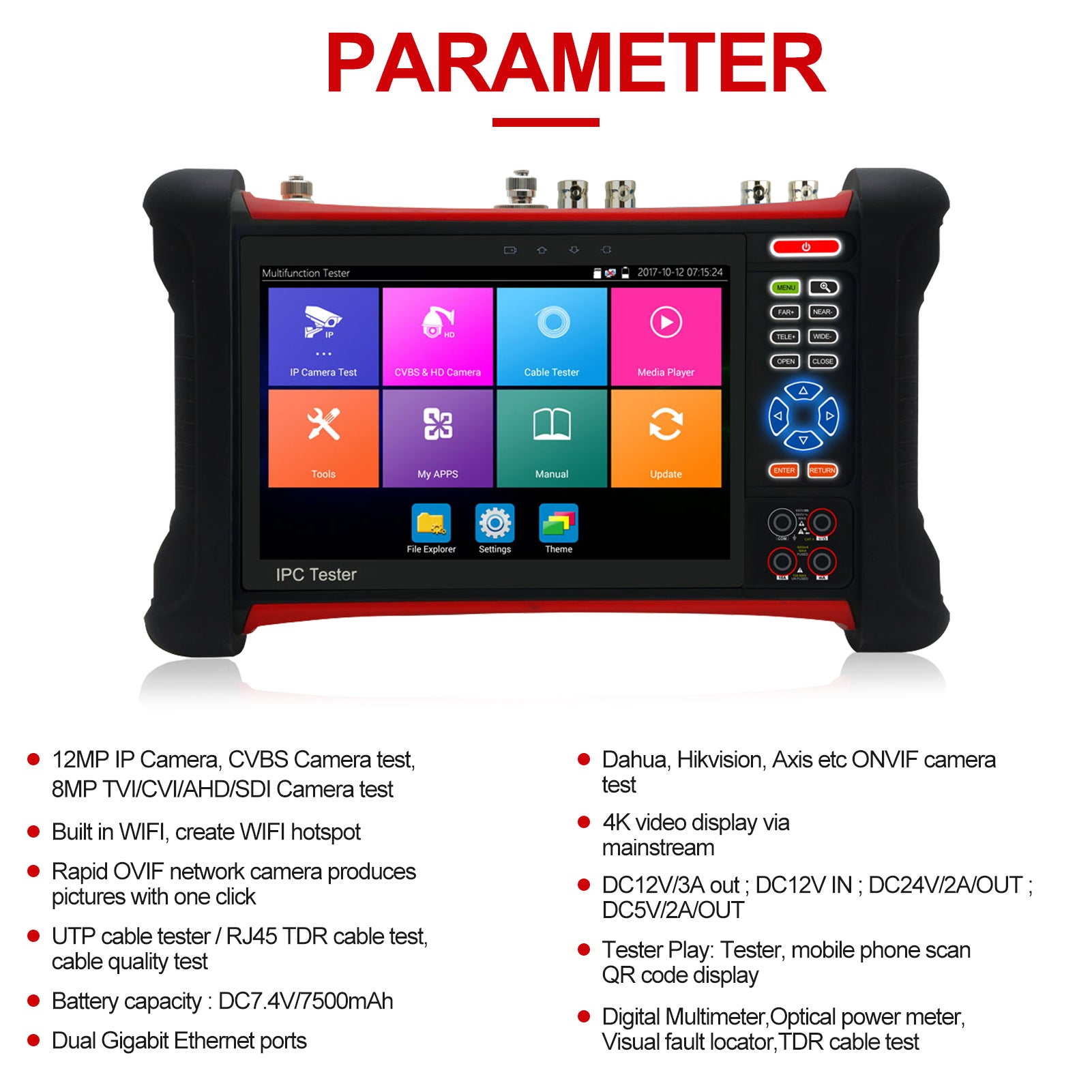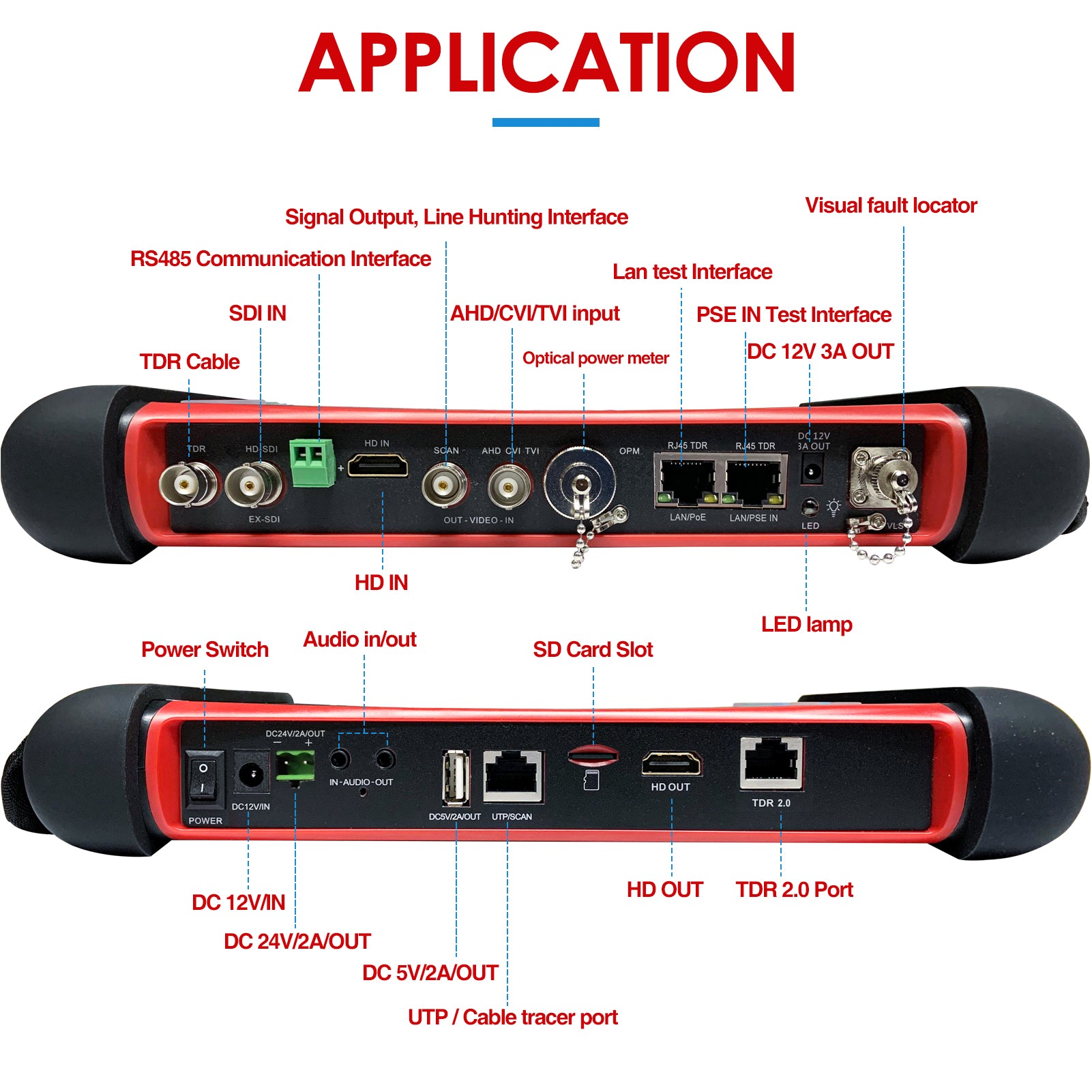 It is the highest level tester of the X7 series, it can support the testing of up to 32MP IP cameras, max 8MP HD CVI TVI AHD SDI cameras, and CVBS cameras. At the same time, it integrates the digital multimeter, TDR, optical power meter, red laser source, and other functions to deal with more difficult problems in work. Built-in Professional test app, Dual Gigabit Ethernet ports, POE, cable test, dual-band WiFi, power output, 4K HDMI input and output, RS485 are all available. Using the Android system, you can automatically update the APP after connecting to the Internet. You can continue to view the details to learn more.