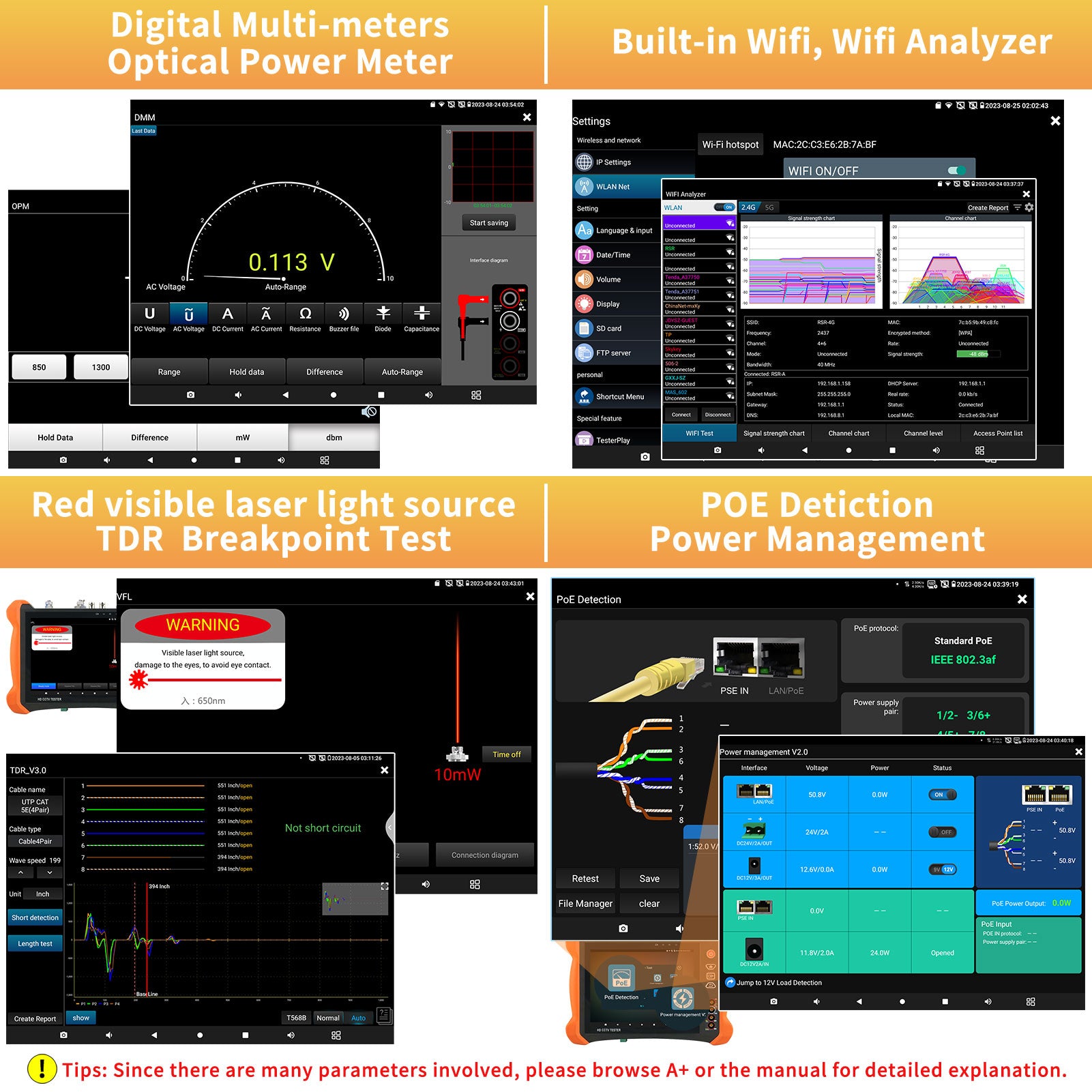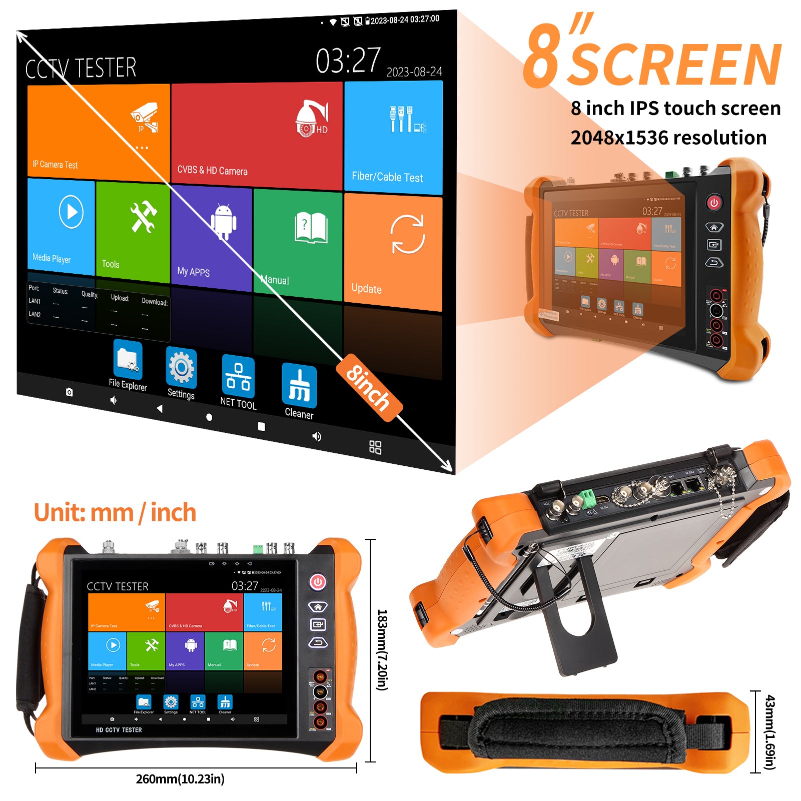 It is the highest level tester of the X9 series, it can support the testing of up to 8K 32MP IP cameras and max 4K 8MP HD CVI TVI AHD SDI cameras and CVBS cameras. 4 channels Rapid ONVIF test function is unique to the X9 series. At the same time, it integrates digital multimeter, TDR, optical power meter, red laser source, and other functions to deal with more difficult problems in work. Built-in Professional test app, Dual Gigabit Ethernet ports, POE, cable test, dual-band WiFi, power output, 4K HDMI input&output, RS485 are all available. Using the Android system, you can automatically update the APP after connecting to the Internet.