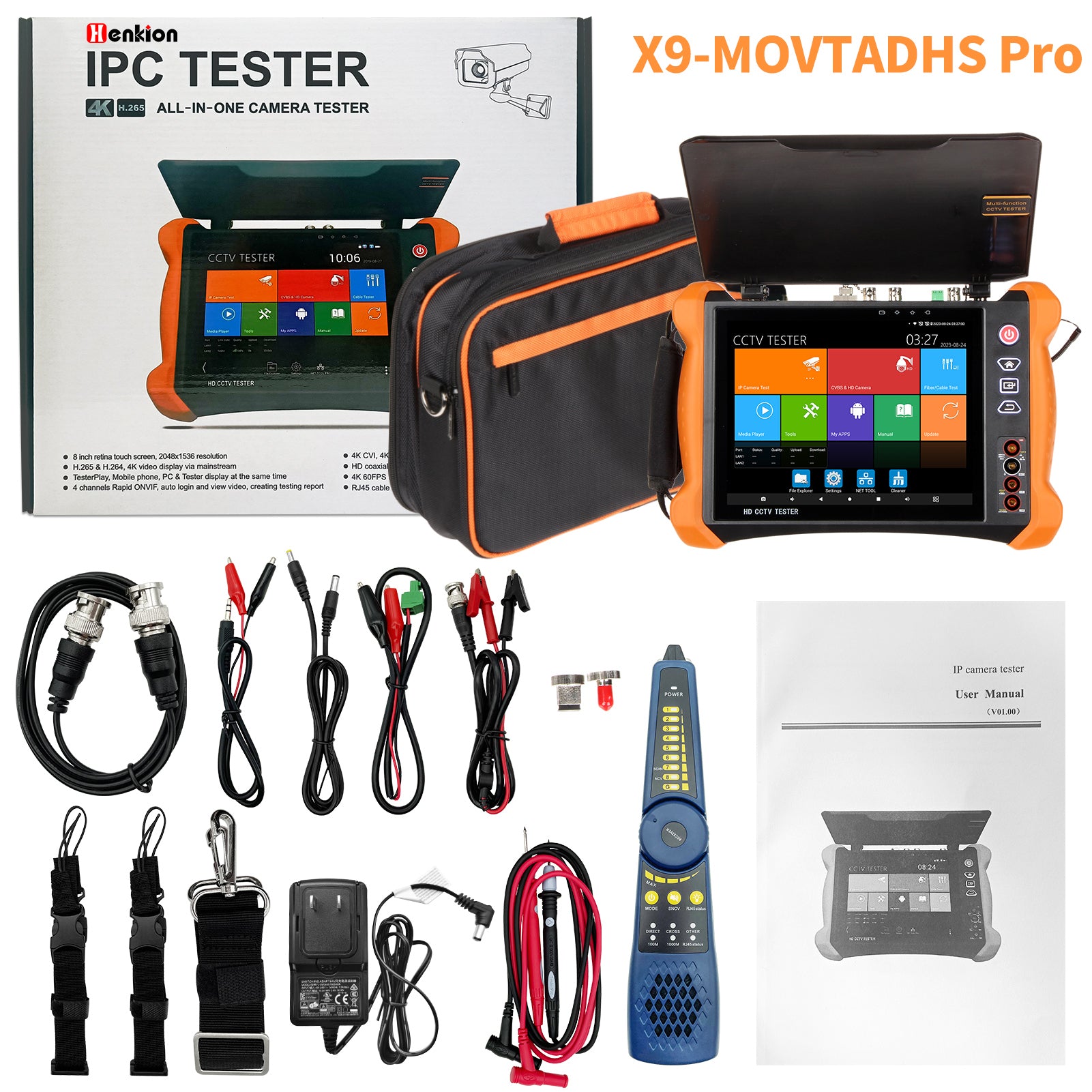 This is Henkion X9-MOVTADHS Pro professional IP and HD coaxial security surveillance camera tester. It is an essential tool for field technicians in the field of security cameras. Used for the installation and maintenance of IP network camera, HD CVI TVI AHD SDI camera, and CVBS camera.