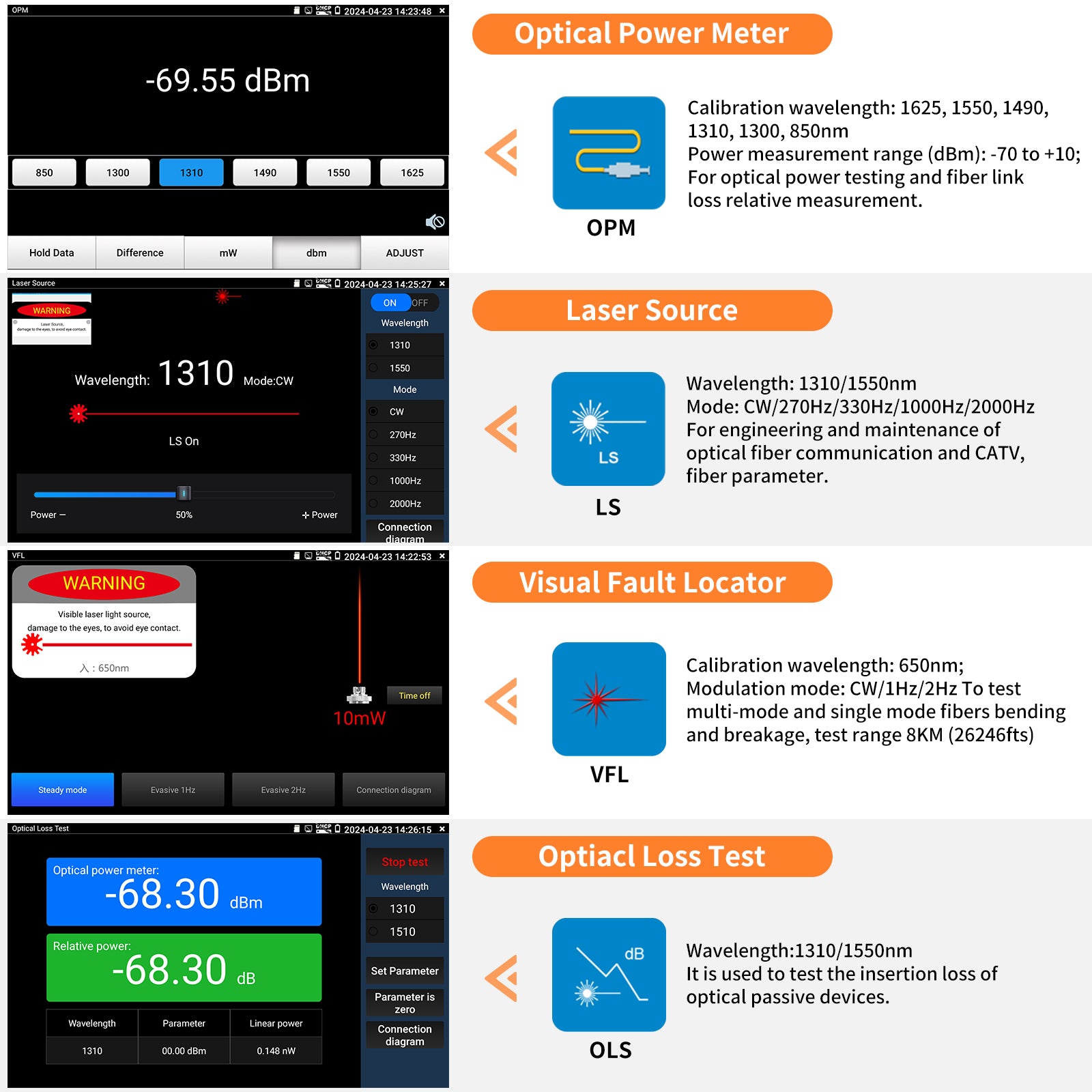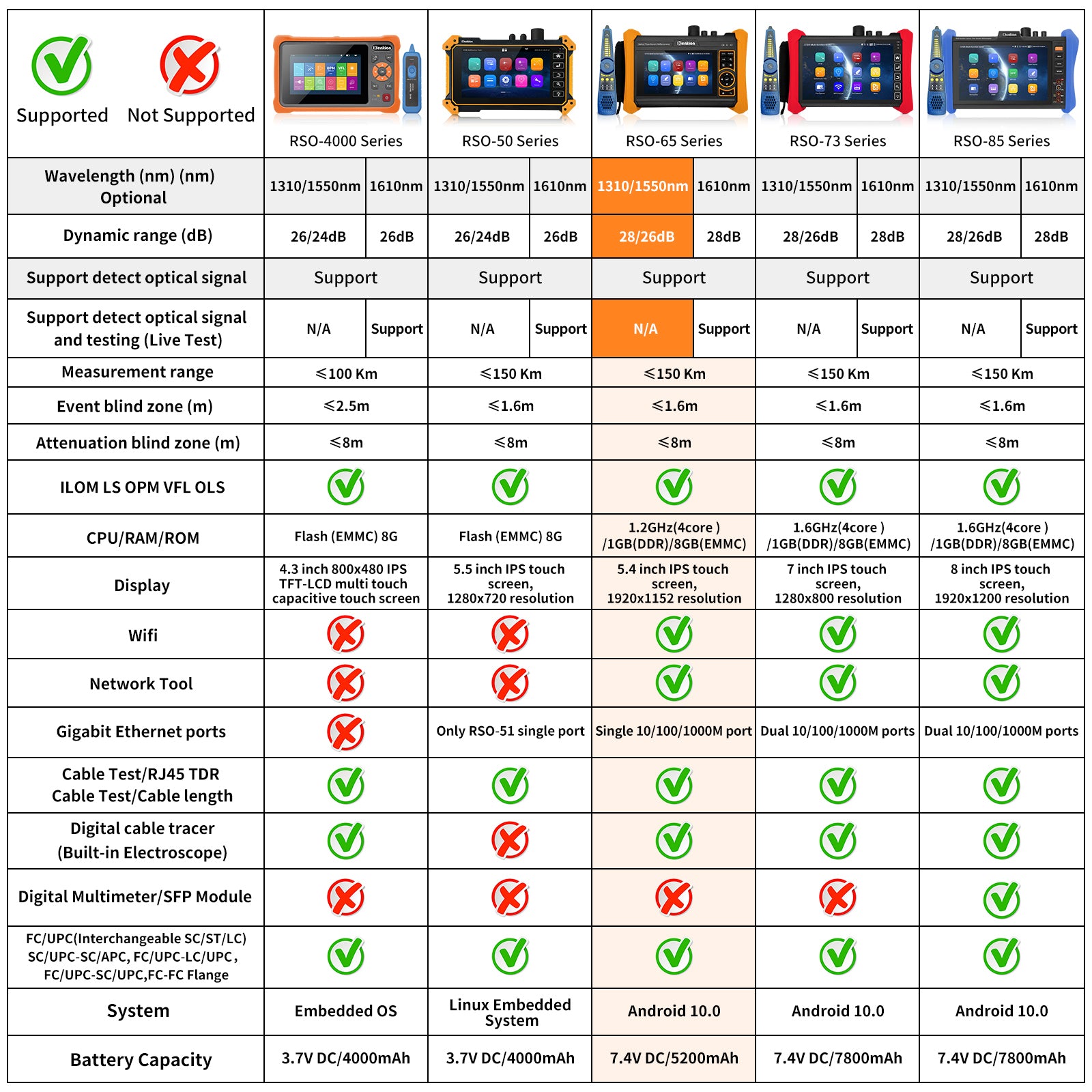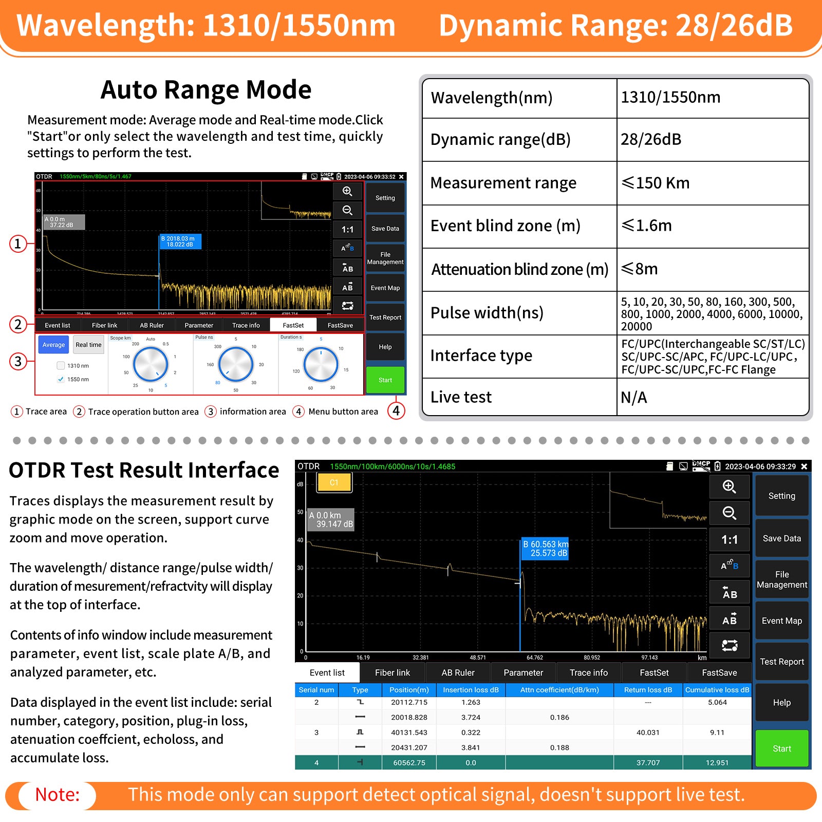 | Support detect optical signal | Support (When an optical signal is detected in the fiber, a prompt will pop up and the test will be disabled to protect the device) | N/A | |||||